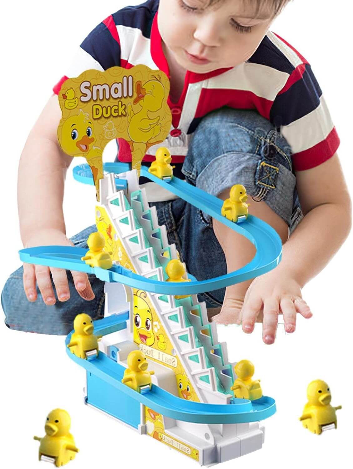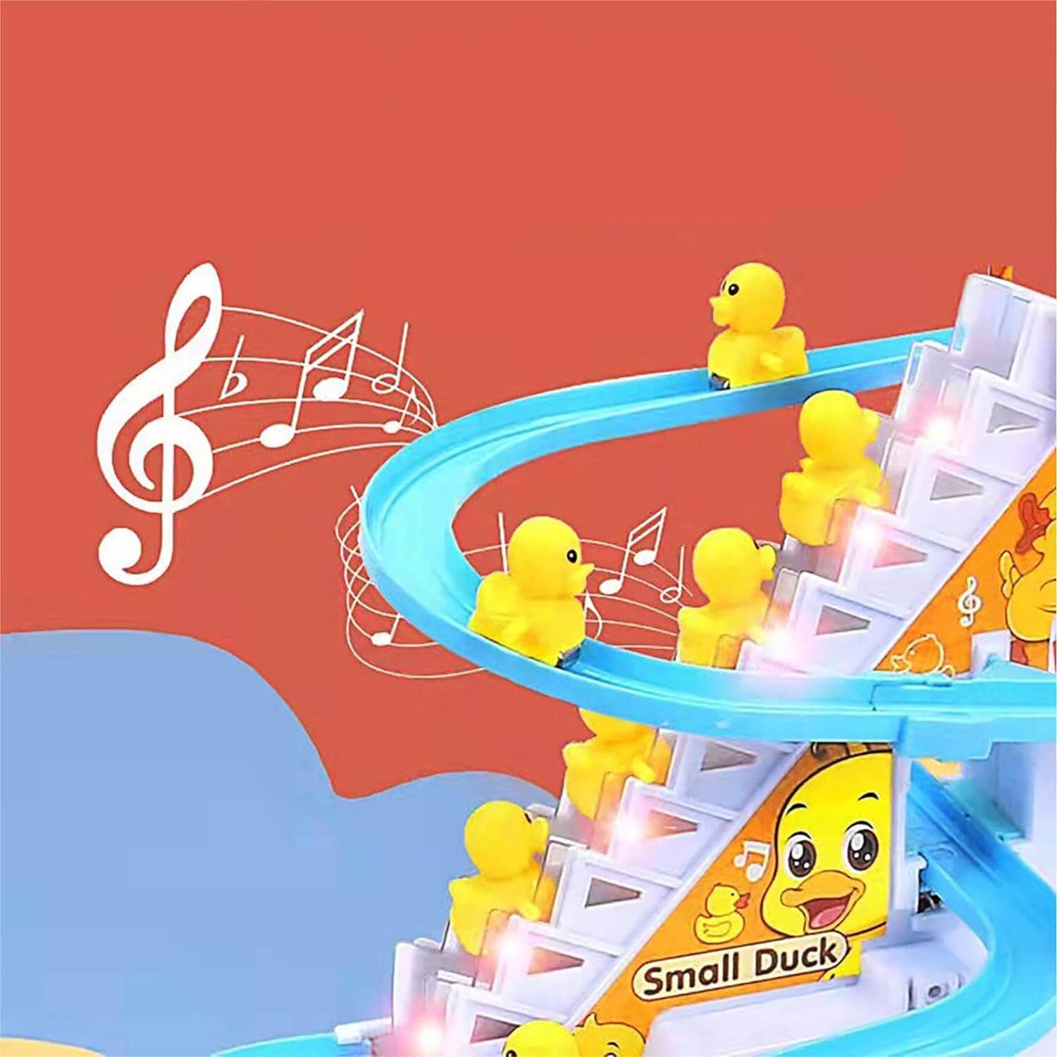 3 Уникальный дизайн: набор имеет яркую подсветку и легкий в сборке эргономичный дизайн, легко собирается. Милые маленькие желтые утки могут лазить по ступенькам и скользить по дорожкам. Игрушка содержит интересные треки и веселую музыку (с кнопкой вкл/выкл).