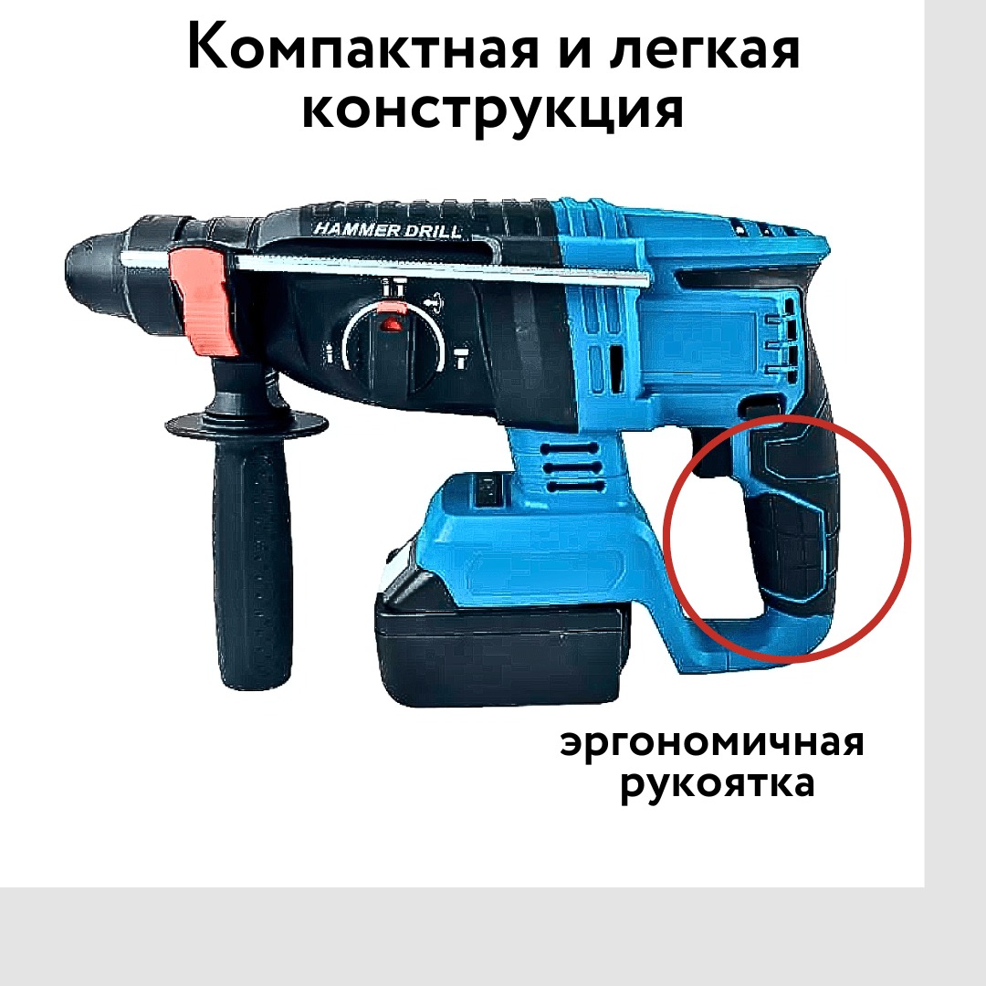 Аккумуляторный бесщеточный перфоратор мощностью 2,5 Дж может легко просверлить металл, каменную кладку и дерево. Литий-ионный аккумулятор 36В улучшает общую производительность и увеличивает время использования, а светодиодная лампа позволяет работать в темных местах. Удобное расположение переключателя режимов и рукоятка с резиновым покрытием (из эластомера) делают инструмент простым в использовании.
