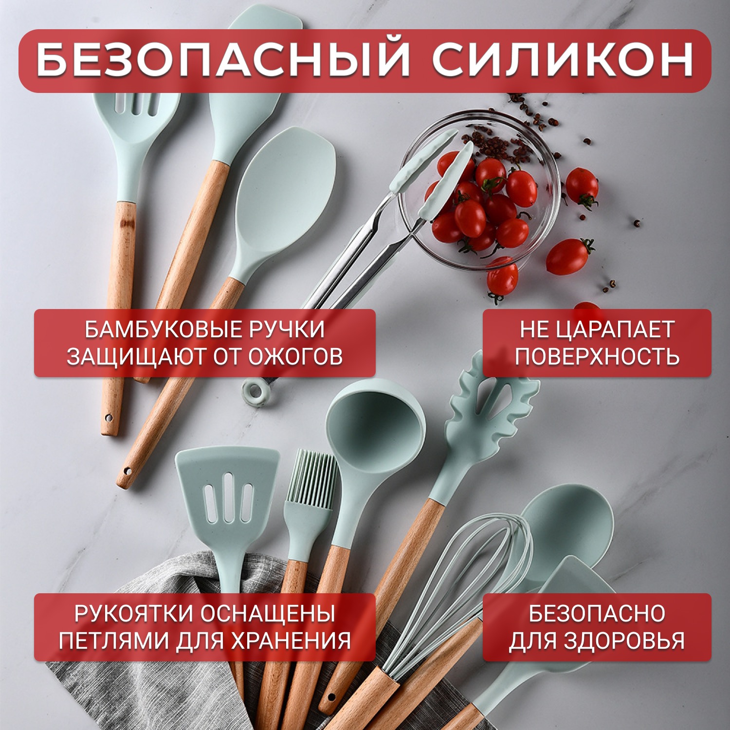 | В комплекте | Лопатка для жарки, шпатель, венчик, щипцы, плоская ложка для выпечки, лопатка с отверстиями для слива масла, половник, ложка для салата, кисточка для масла, ложка для спагетти, шумовка, подставка |