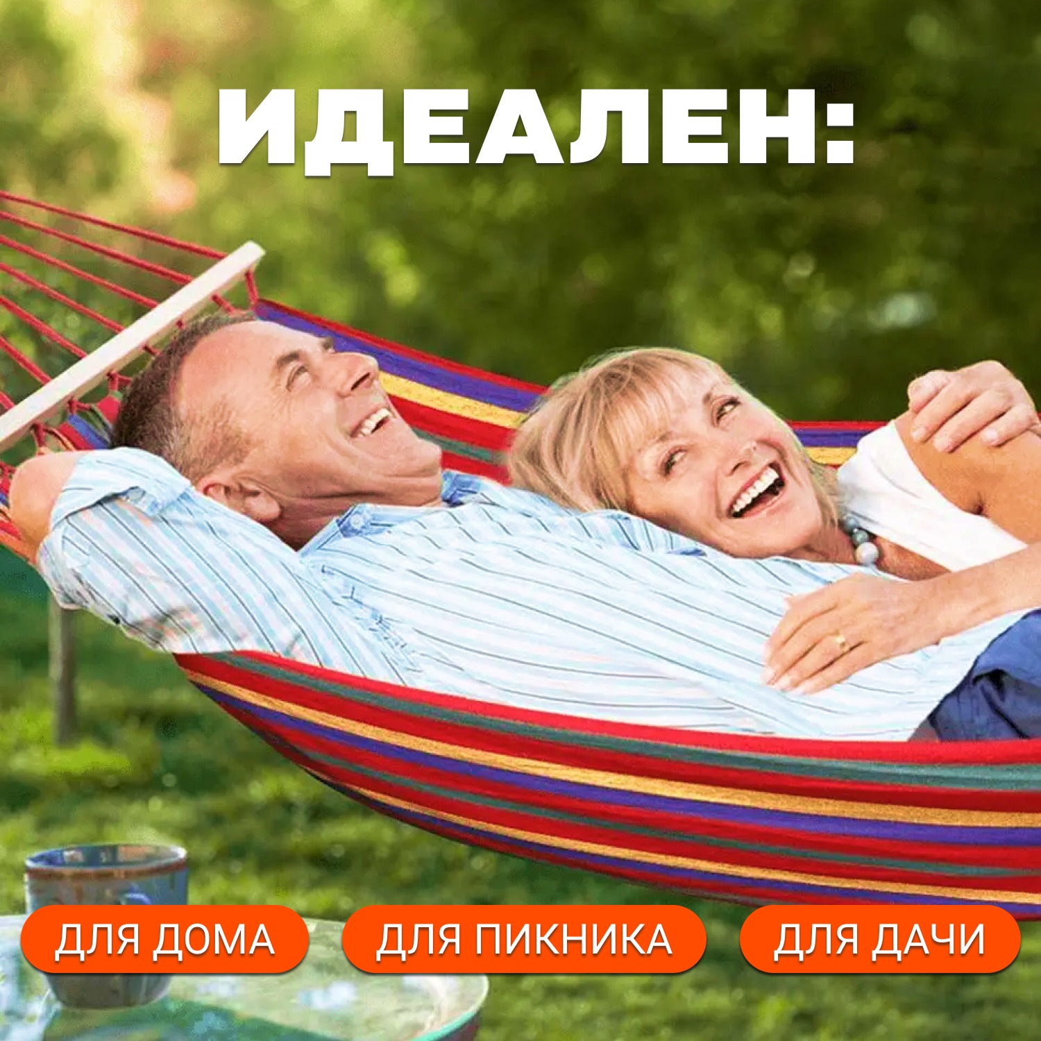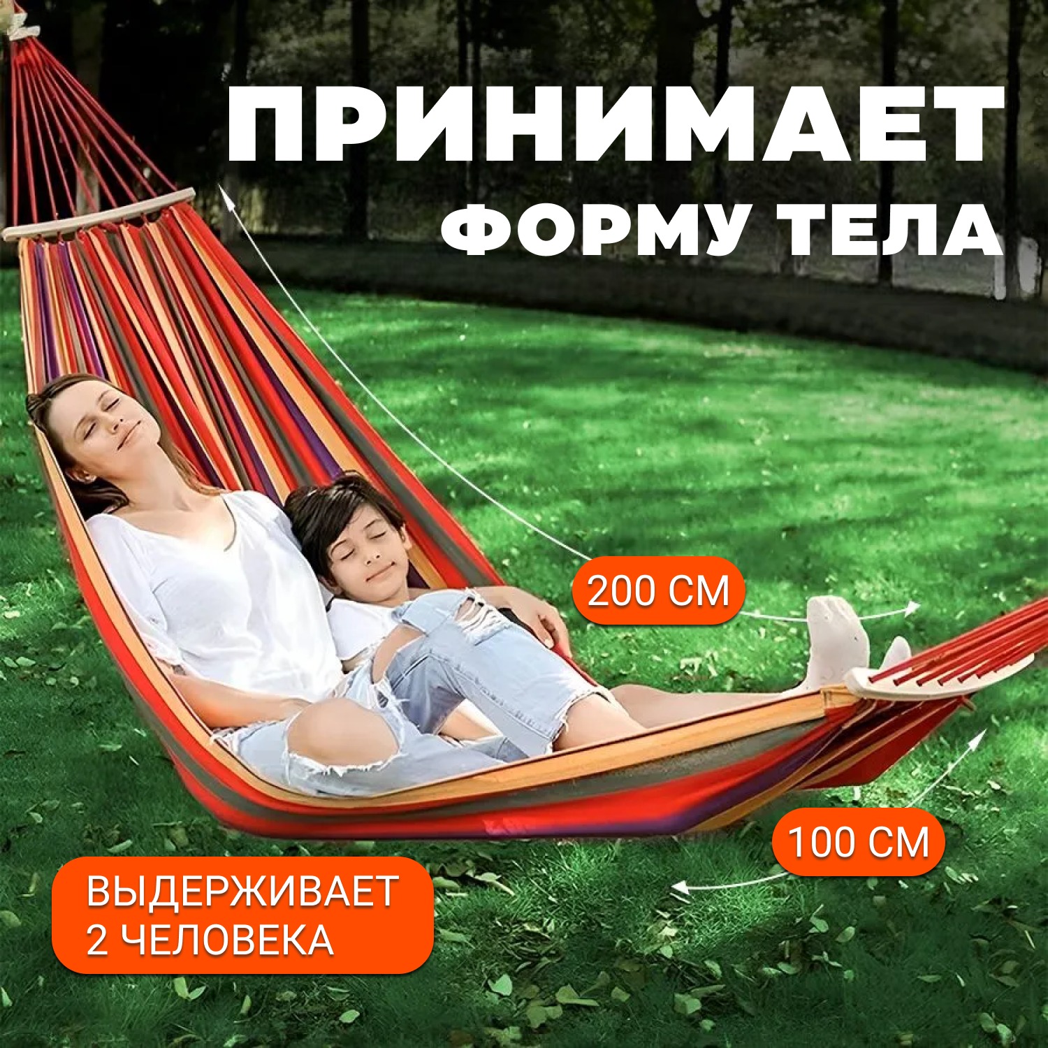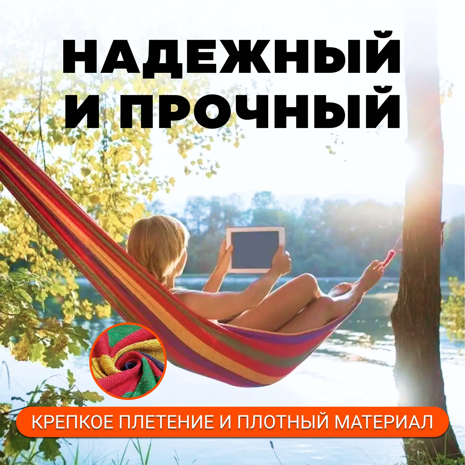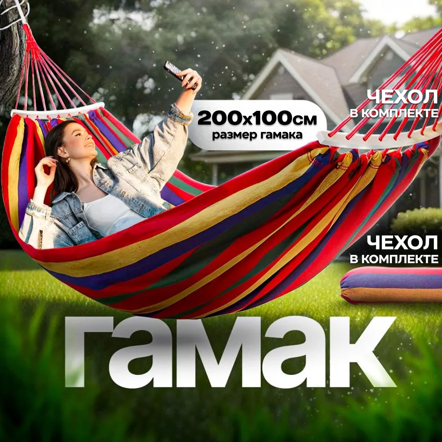Разноцветный гамак для отличного проведения времени всей семьи на свежем воздухе. В нём можно загорать, читать книгу, работать за ноутбуком или просто отдыхать.