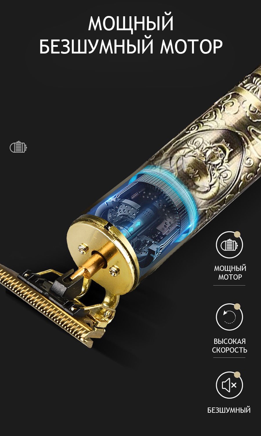 Отличается прочным алюминиевым корпусом, устойчивым к вибрации, низким уровнем шума, стильным винтажным дизайном с гравировками, плавным ходом острых лезвий и длительным сроком службы. Во время работы устройство не создает значительного шума. Сменные насадки позволяют выбрать длину стрижки от 1 до 3 мм (3 насадки: 1, 2, 3 мм).