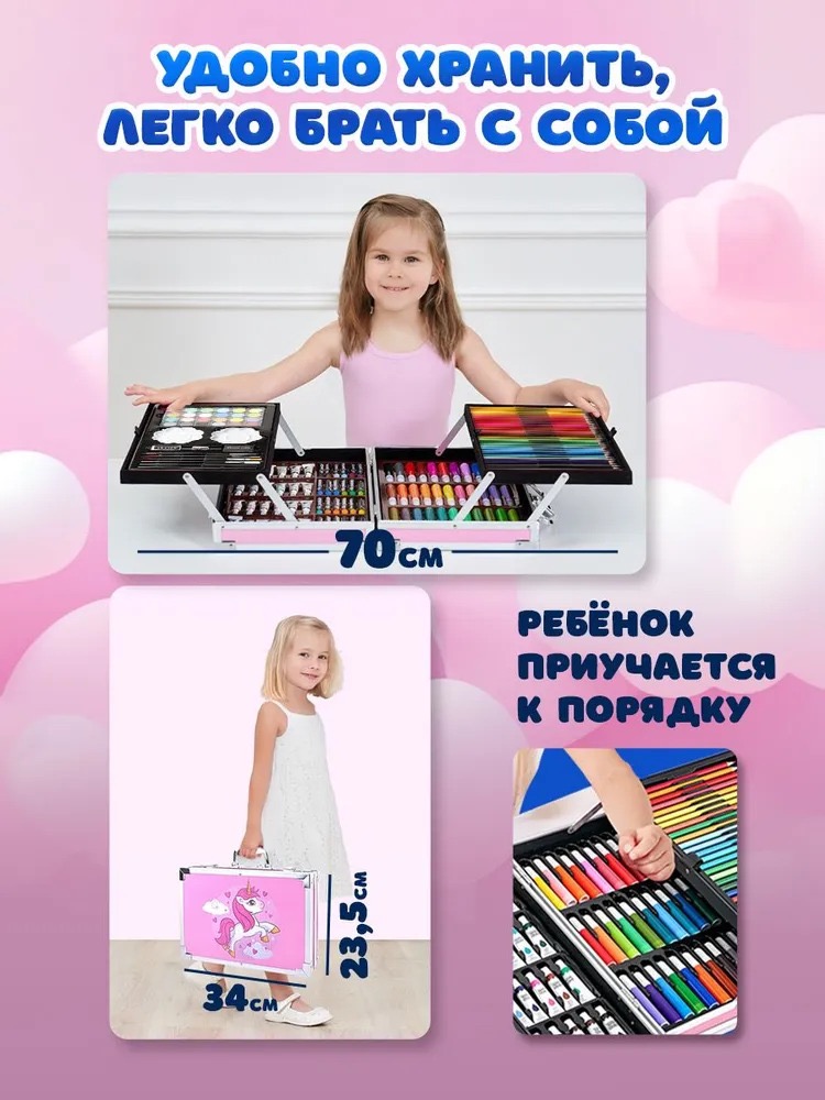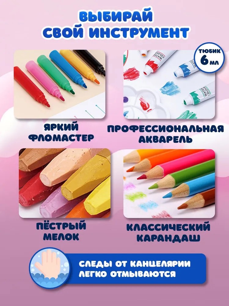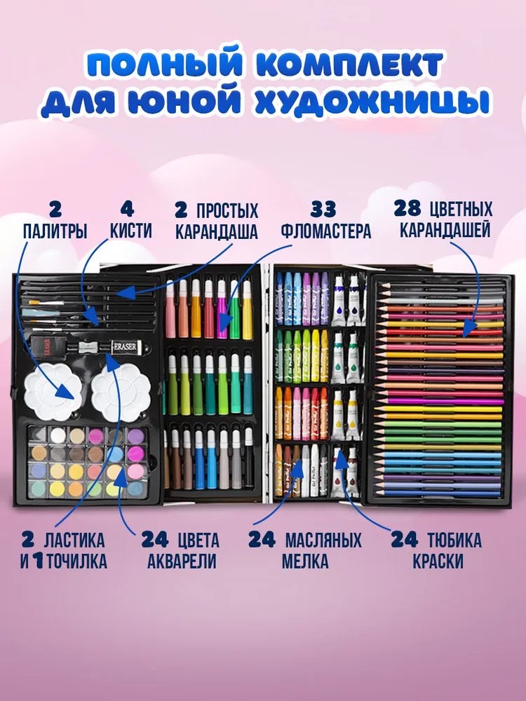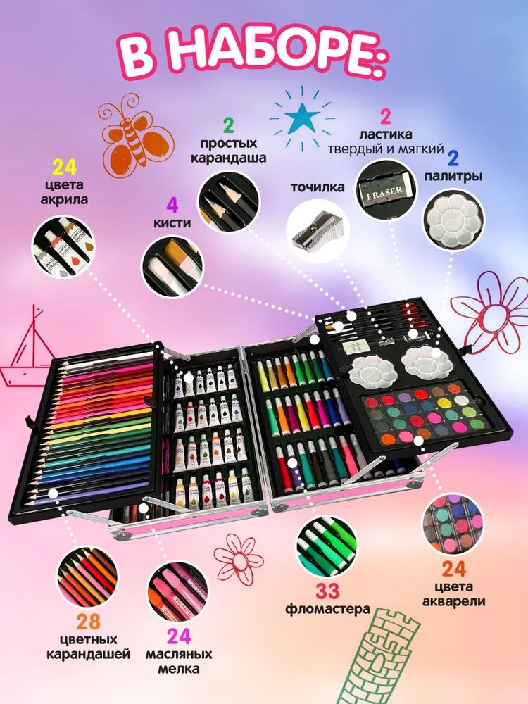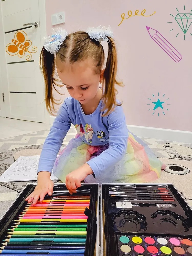 В нем есть 145 предметов на все случаи: несколько видов карандашей, фломастеры, краски, ребенок сможет попробовать все стили прорисовки, при этом вы не потратите лишние деньги. В комплекте Вы найдете все что нужно для «красочного творчества»: краски, карандаши, фломастеры и другие мелкие аксессуары.