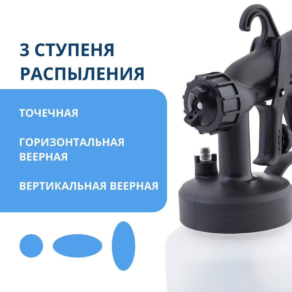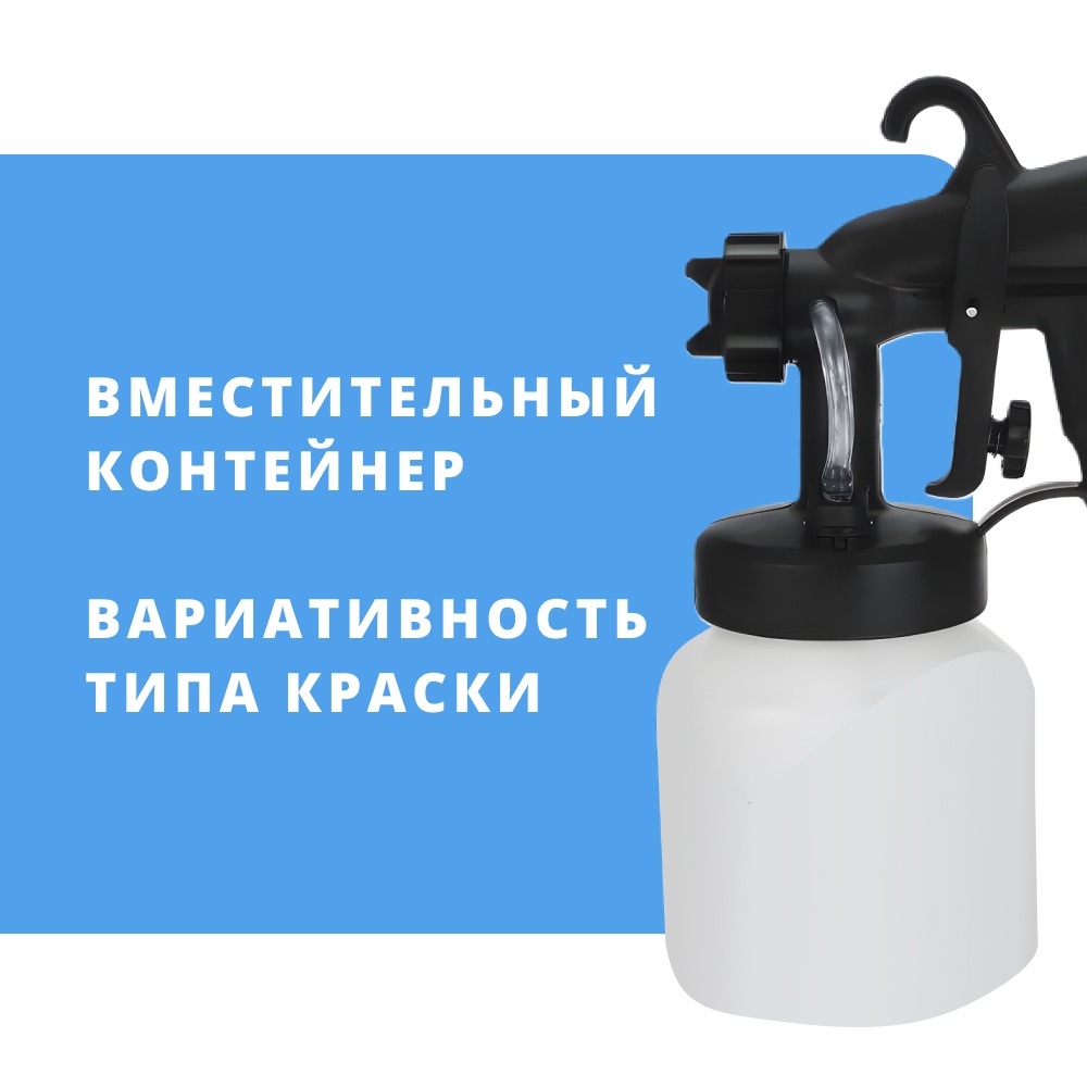 Краскораспылитель объемом 800 мл, так что вам не придется постоянно наполнять его. Кроме этого, вы сможете использовать любую краску - даже масляную и масляную, так как максимальная допустимая вязкость краски, которую распылит пульверизатор, составляет 130 дин/с.