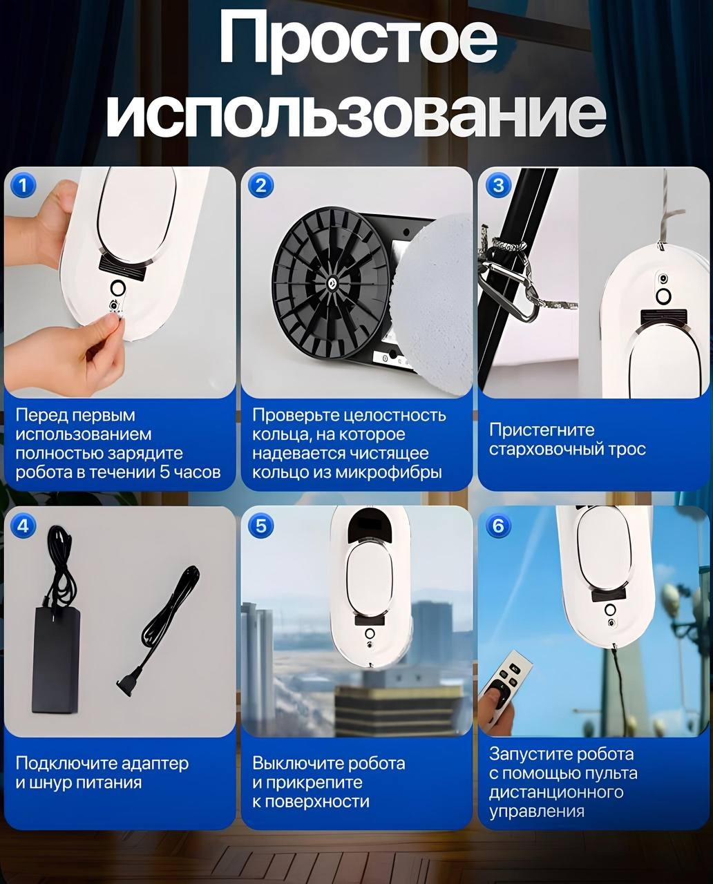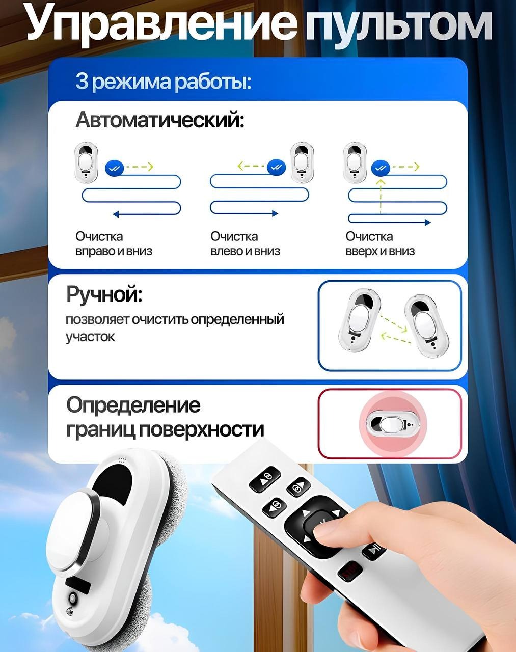 Робот для мытья окон соответствует различным потребностям в уборке. Например, он может использоваться для ежедневной уборки, нажатие для запуска, пульт дистанционного управления, 3 режима для переключения по желанию.Высокая скорость очистки - всего за 3 минуты он справляется с очисткой одного квадратного метра поверхности без разводов и пропусков!