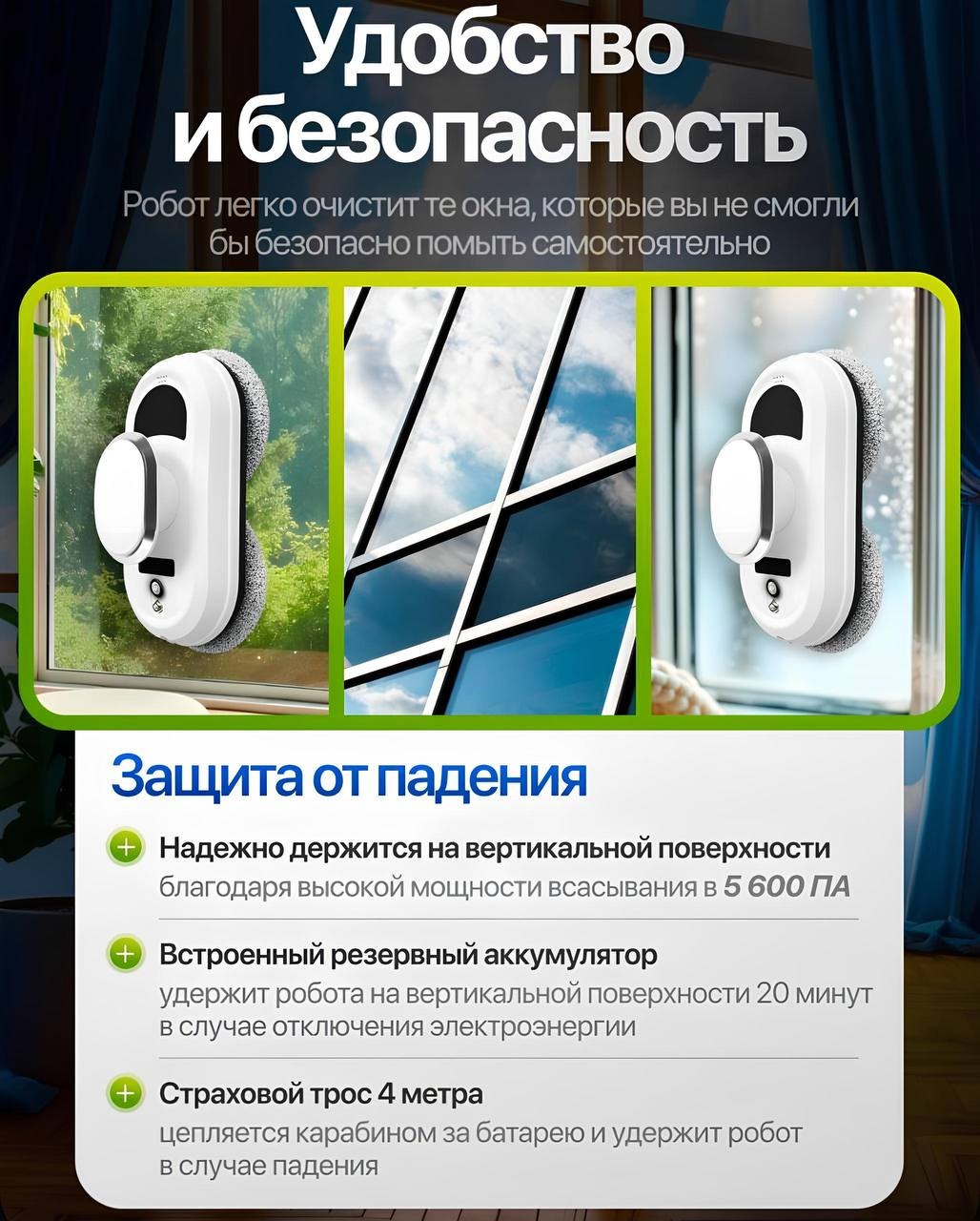 Робот для мытья окон не упадет в случае отключения питания. Робот для мытья окон может адсорбироваться на стекле в течение 20 минут и подавать непрерывный сигнал в случае случайного отключения питания. Кроме того, робот оснащен страховочным тросом альпинистского уровня для обеспечения безопасности во время мытья окон в высотных зданиях.Он легко чистит: