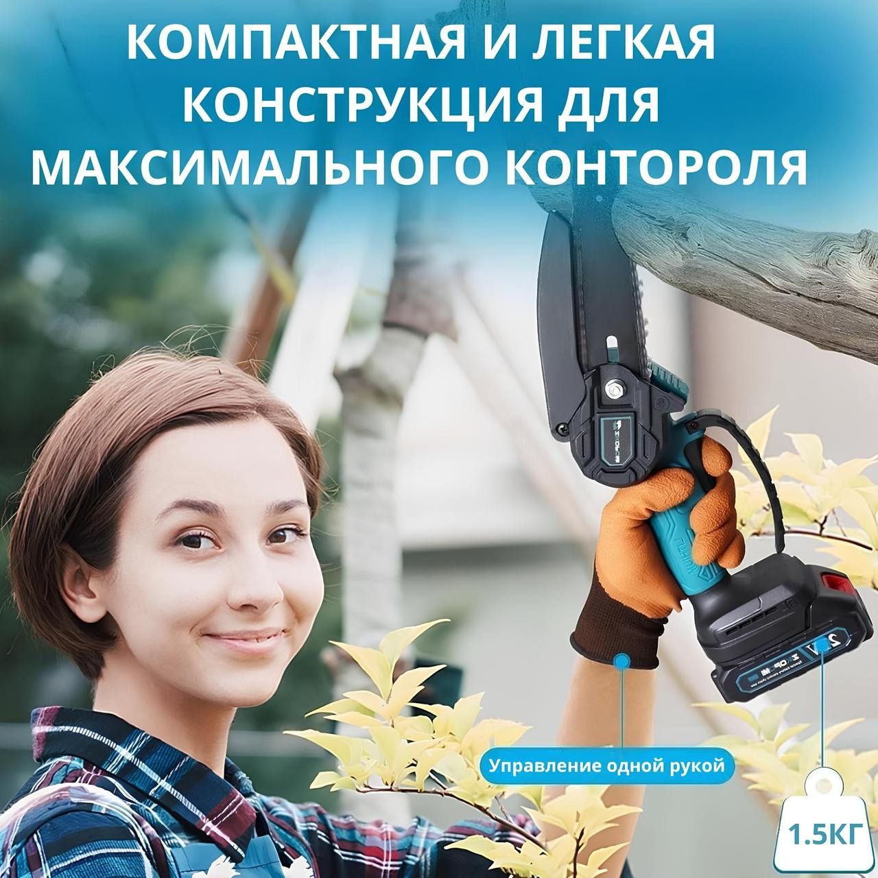 Аккумуляторная мини-пила – отличается высокой мобильностью в сочетании с небольшим весом всего 1.2 кг, включая батарею. Это делает его универсальным помощником при обрезке деревьев и кустарников, а также при обработке и рубке и обрезке по длине доски, квадратной и круглой древесины. Подходит для владельцев земельных участков и садов, а также ремесленников.
