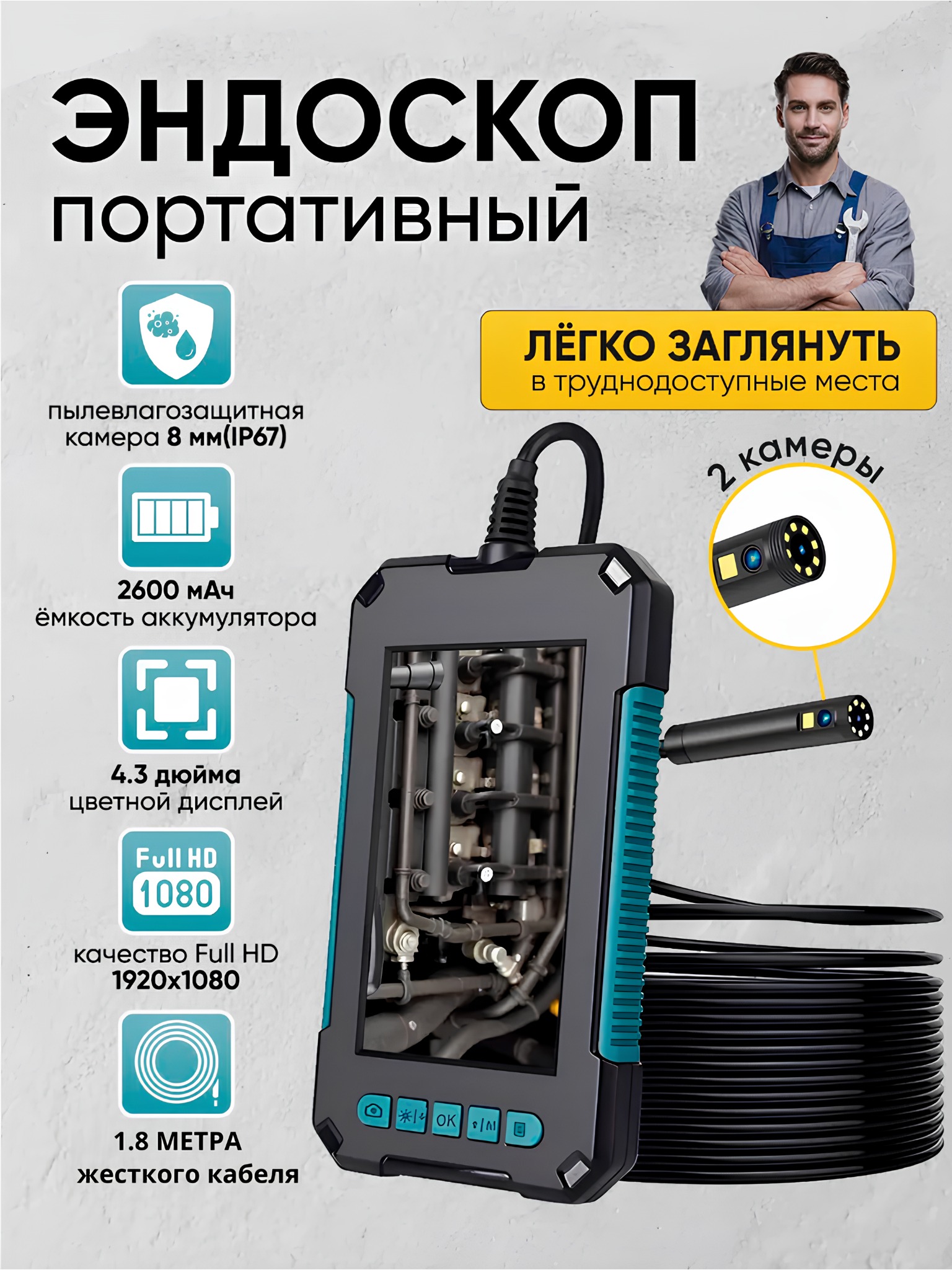 Эндоскоп профессиональный из ЖК 4.3 дюйма 5.5мм 1.8м MicroSD IP67 1 камера, P40