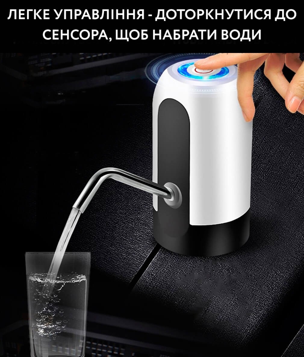 - Вам більше не потрібно натискати на пневматичну кнопку, щоб набрати води з сулія, достатньо лише торкнутися сенсора помпи.