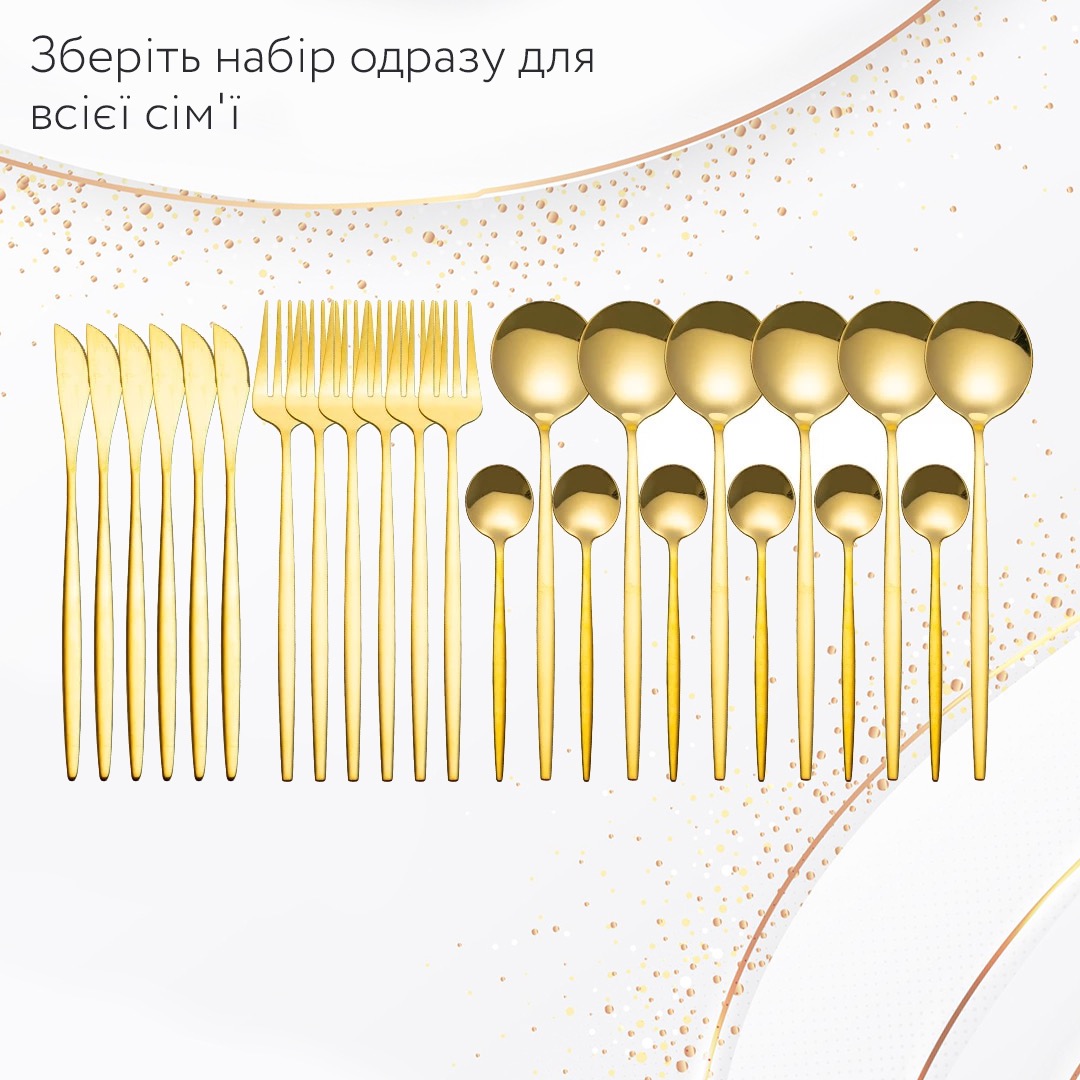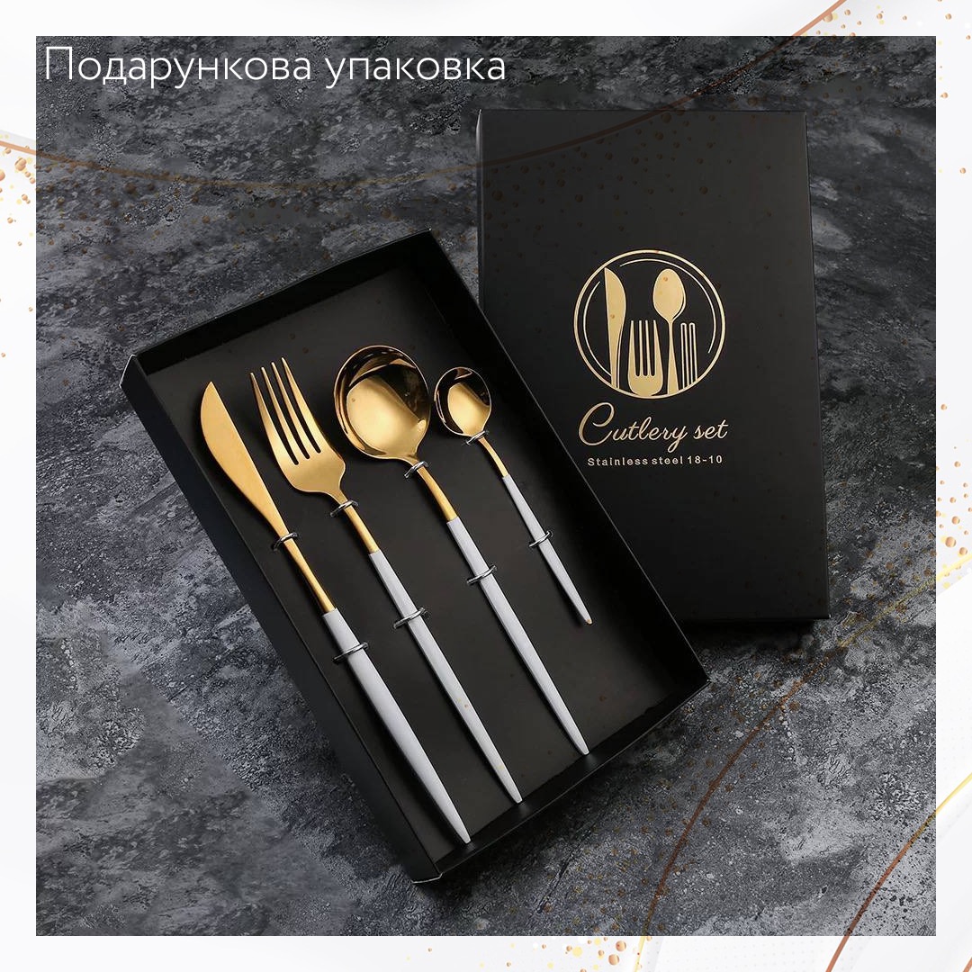 Набiр з 4 предметiв : Цей набiр включає 1 обідню виделку, 1 десертну ложку, 1 обідню ложку та 1 обідній ніж