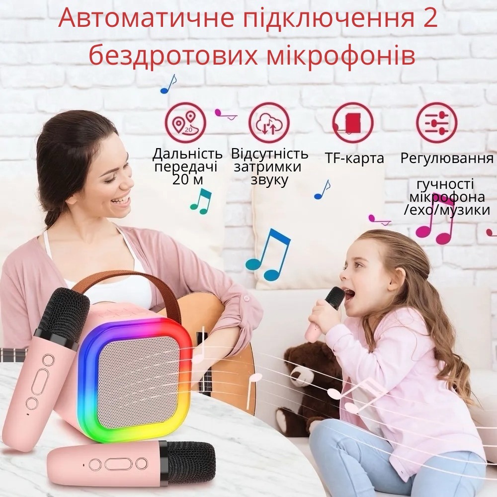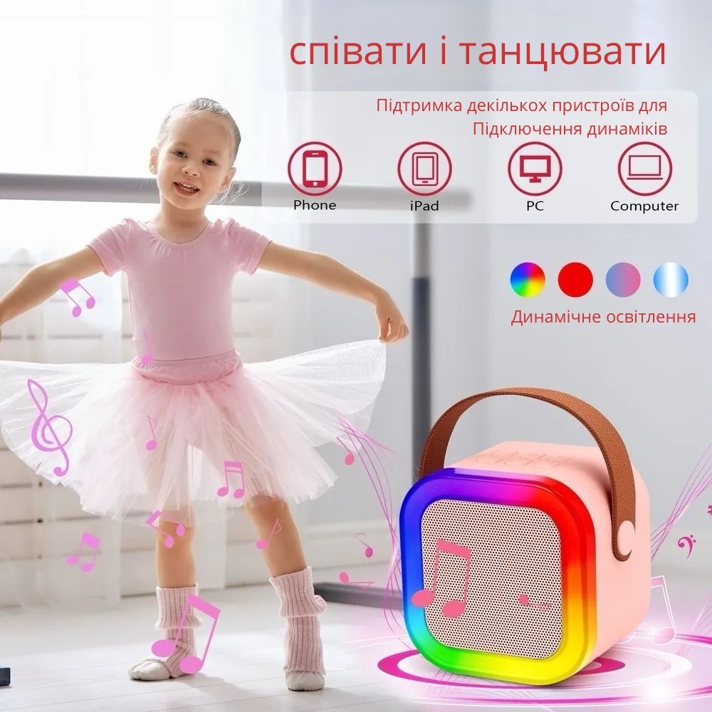 Міні-колонка і мікрофон для караоке ідеально підходить для дітей різного віку. Світлодіодні ліхтарі на колонці створюють веселу атмосферу. Режими підсвічування можна змінювати. Благодаря співом чи сімейних вечорів караоке.