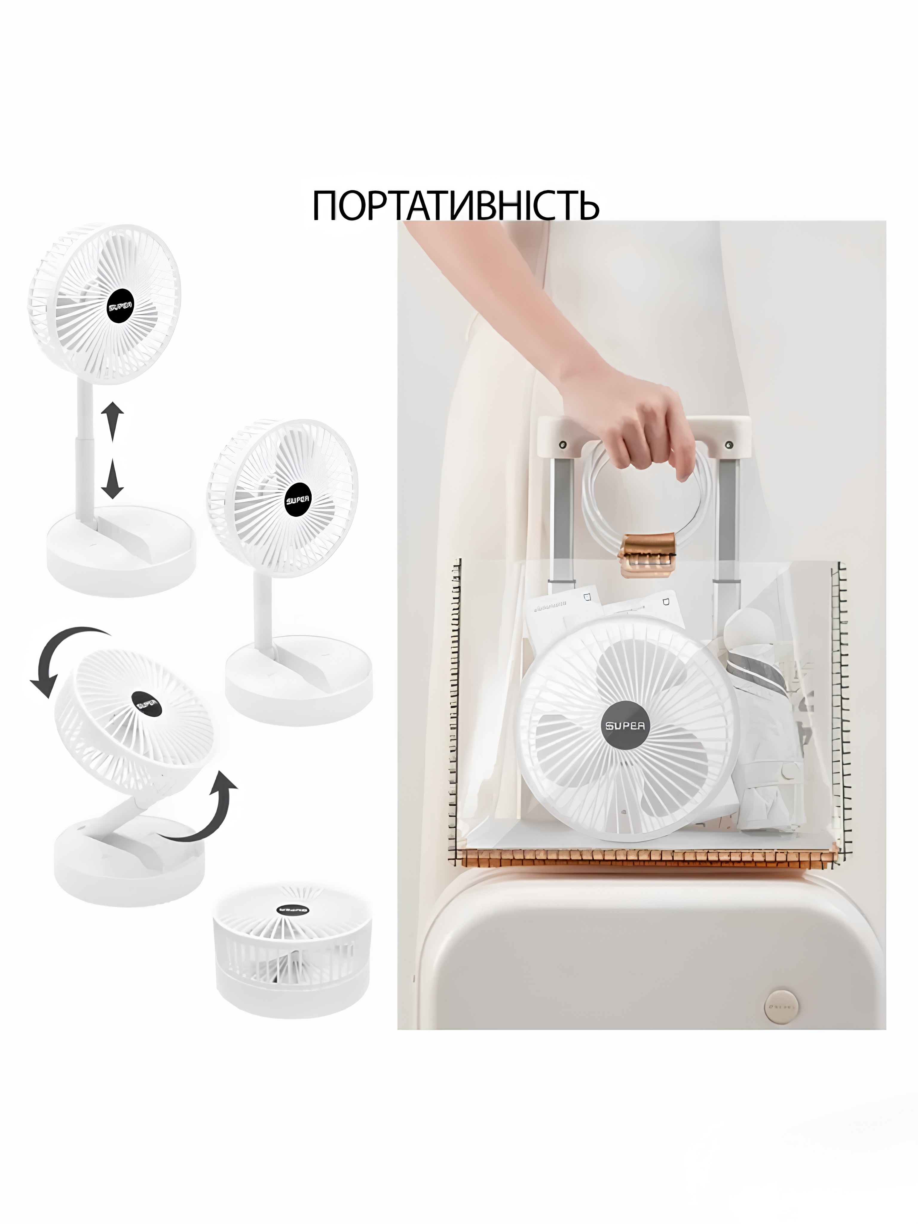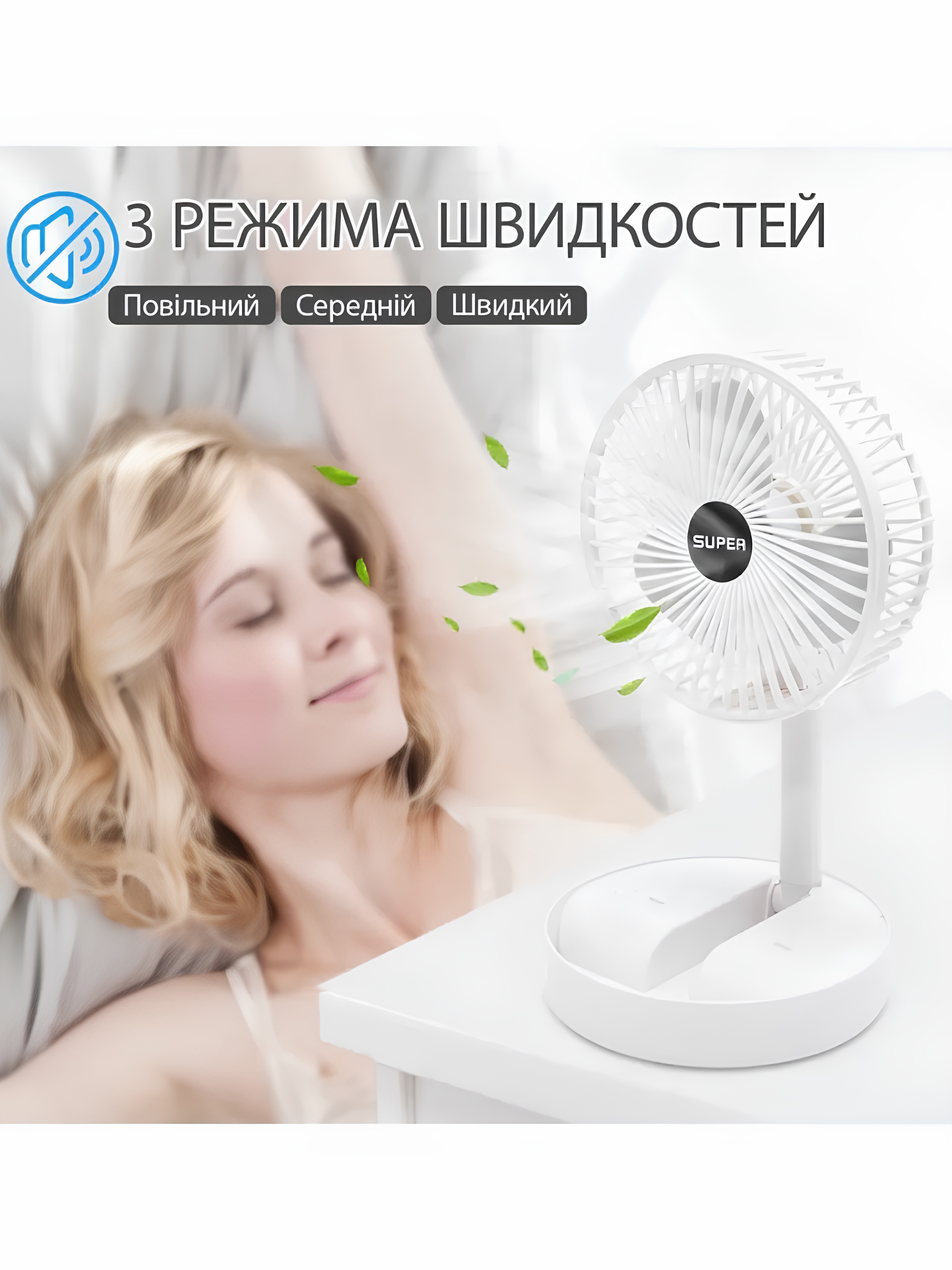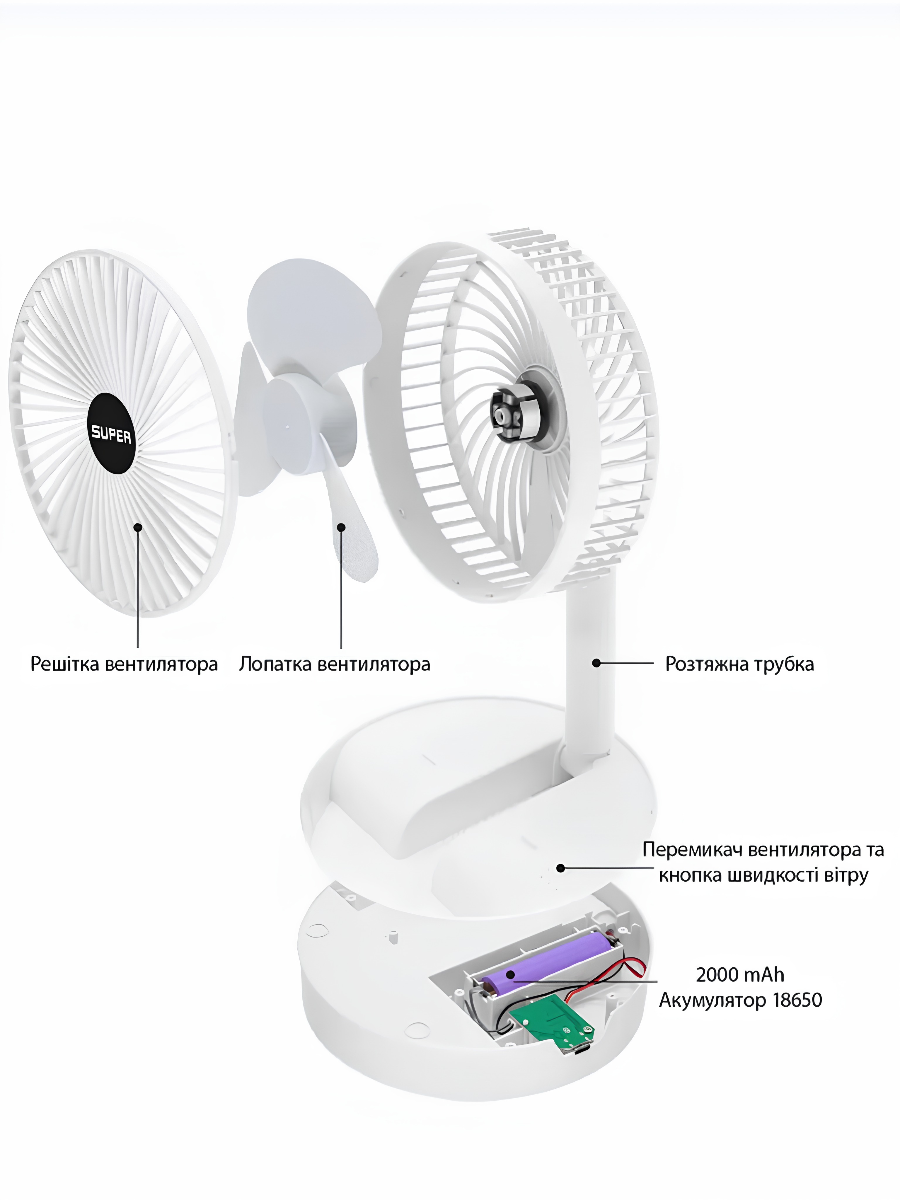 | Комплектація | Настільний акумуляторний вентилятор, змінний акумулятор 18650, додатковий змінний акумулятор 18650, USB-кабель для зарядки, блок живлення, упаковка та інструкція |