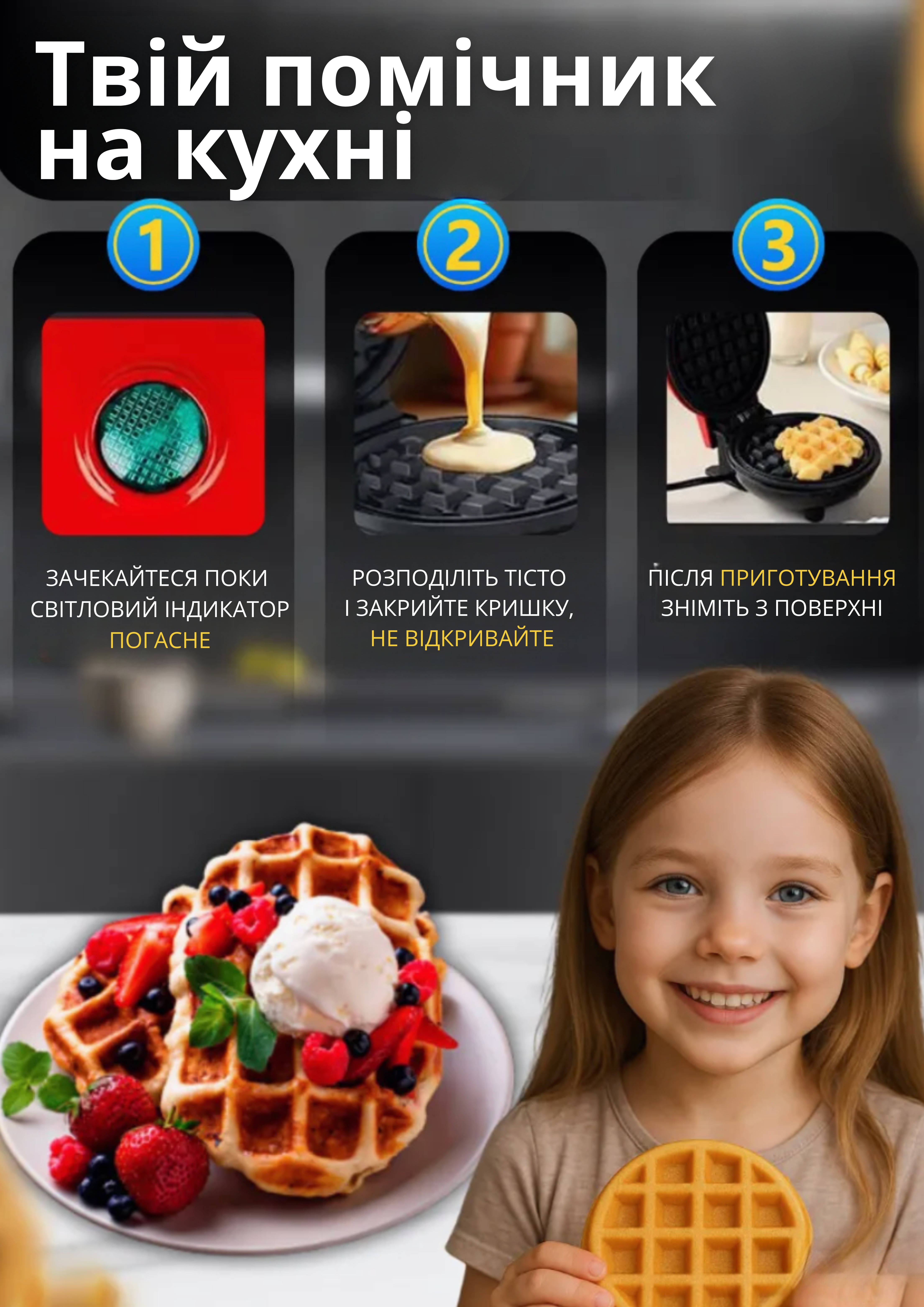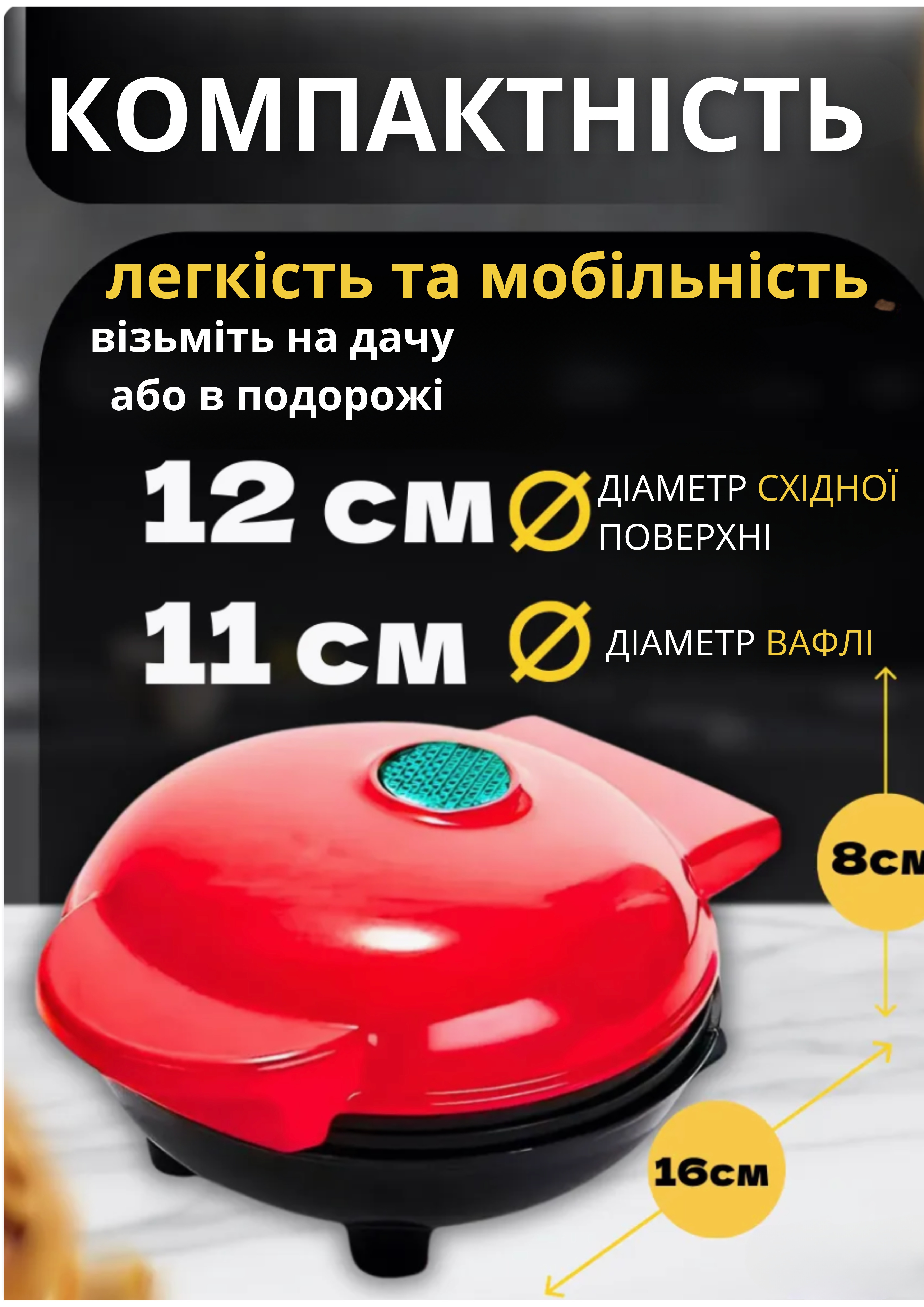 Ця компактна вафельниця — чудовий вибір для швидкого та смачного сніданку. Завдяки антипригарній поверхні діаметром 12 см ви з легкістю приготуєте не лише вафлі, а й омлети, сендвічі, картоплю, печиво та інші смаколики. Прилад оснащено індикатором нагріву та термостійкою ручкою, що робить користування безпечним та комфортним. Легка вага й невеликий розмір дозволяють брати її з собою в подорожі, а стильний червоний дизайн прикрасить будь-яку кухню.