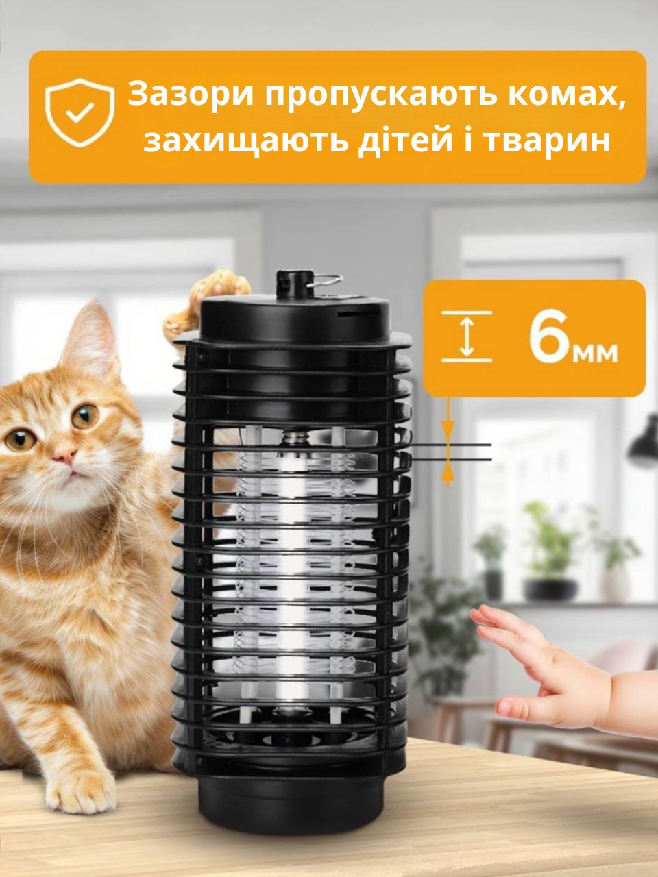 Завдяки УФ-лампі потужністю 3 Вт пристрій ефективно приваблює літаючих комах у зоні дії та миттєво знешкоджує їх при контакті з сіткою.Безпека понад усе.