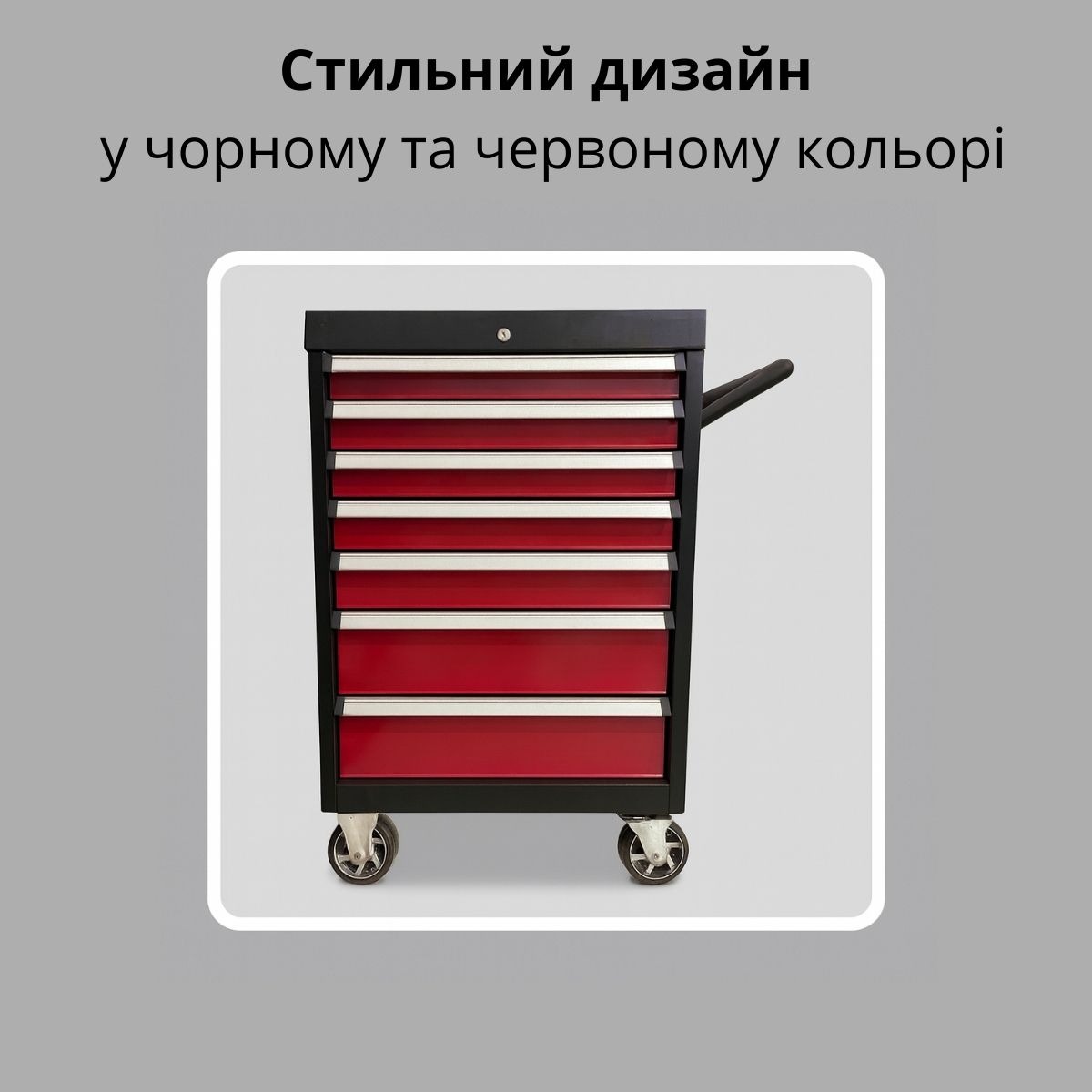 Тележка оснащена 7 висувними шухлядами на кулькових направляючих з повним висуненням. Кожна шухляда закривається клавішним замком а для додаткового захисту передбачений центральний замок. На боковій стінці є перфорація для встановлення гачків і підвісного інструменту.