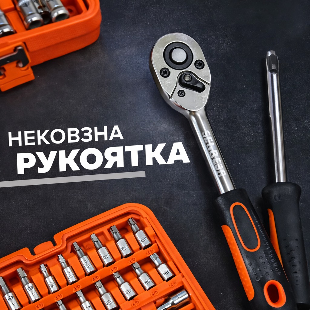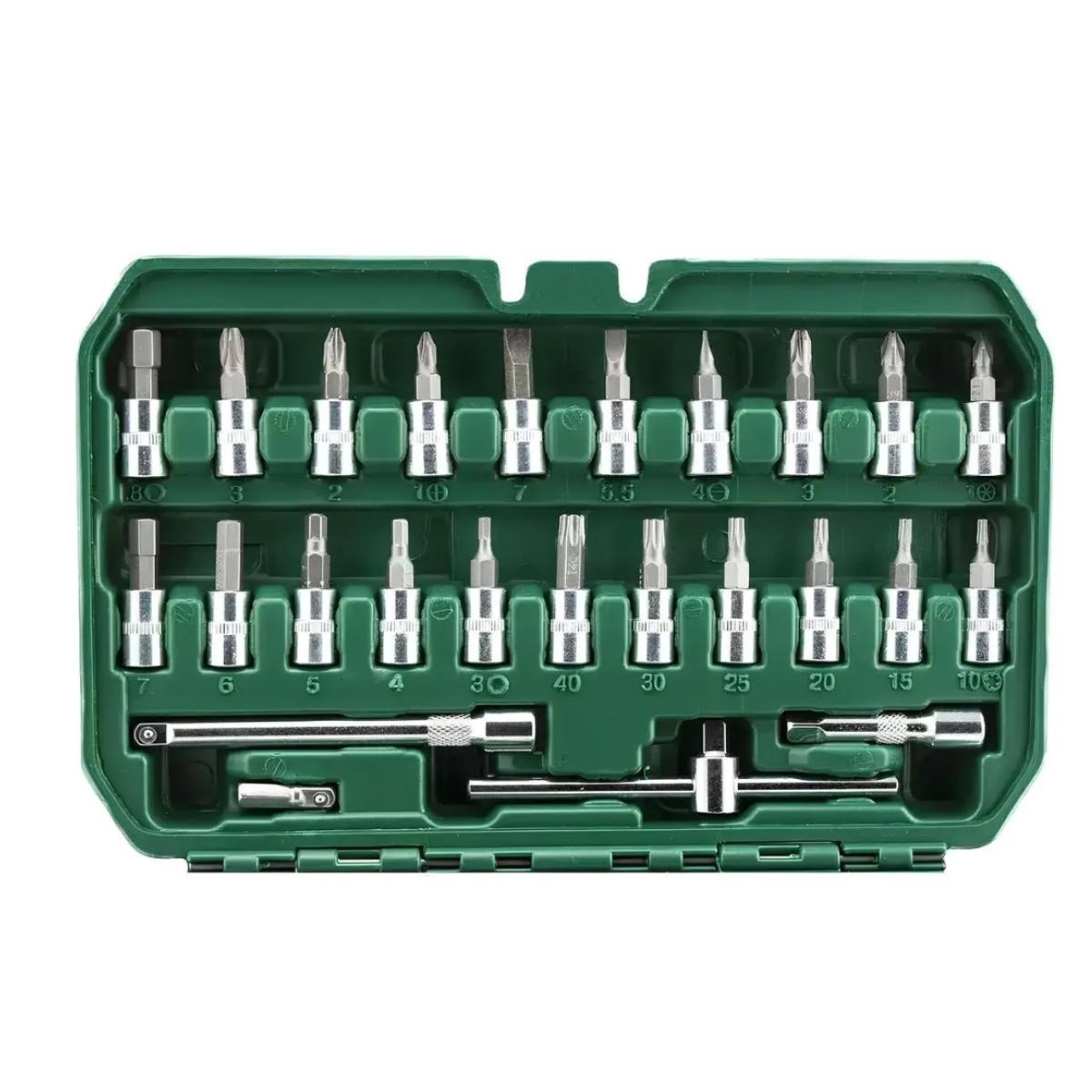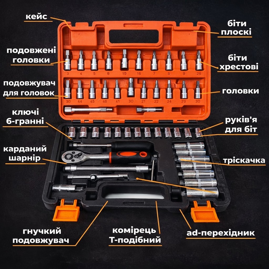У комплект входять подовжені головки, різноманітні біти, подовжувач, тріскачка, карданний шарнір та ключі. Такий набір дозволяє виконувати широкий спектр ремонтних і сервісних робіт з максимальним комфортом та ефективністю.
