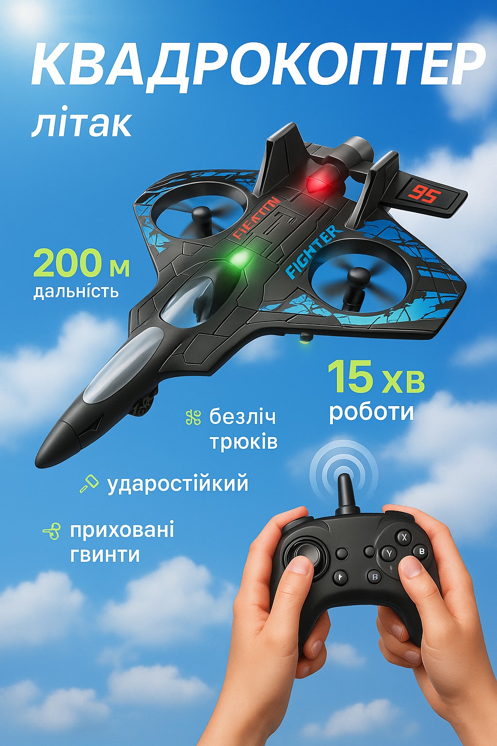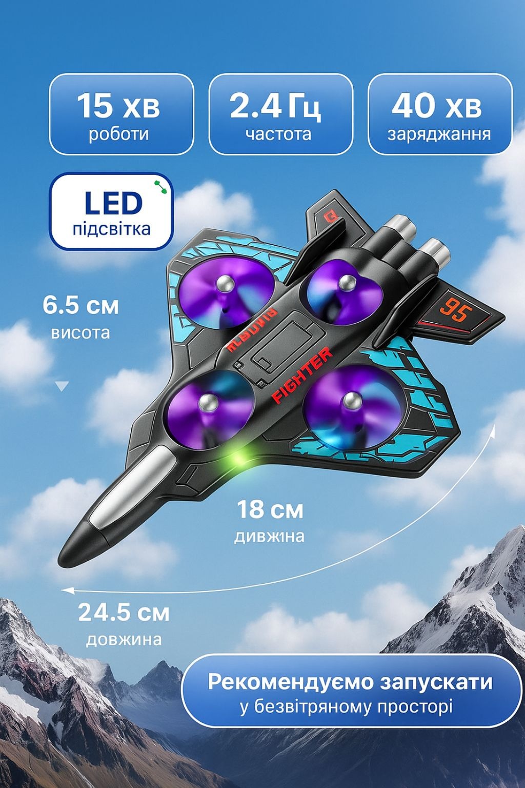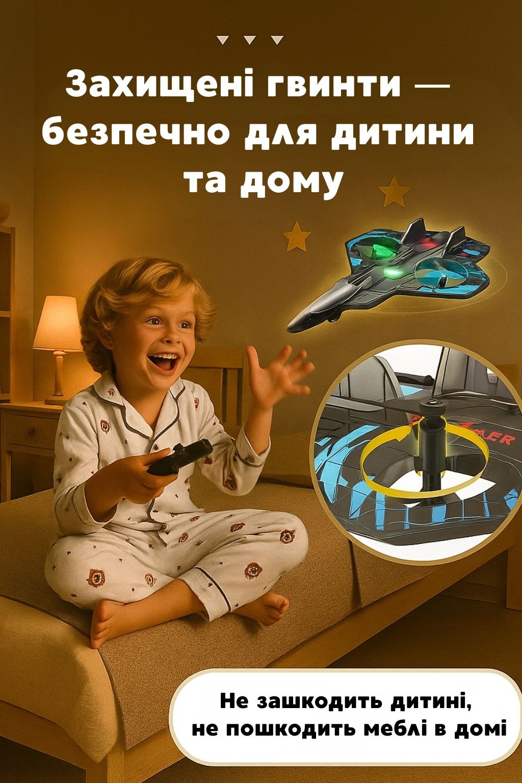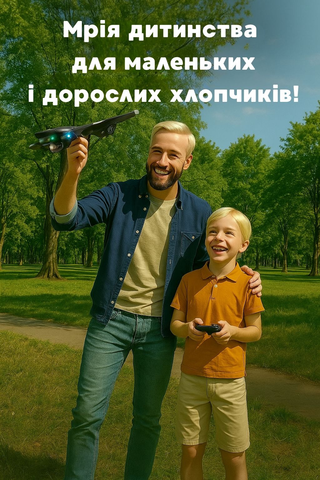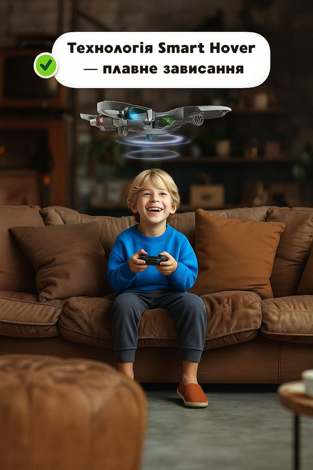 Пульт дистанційного керування працює від трьох батарейок типу AAA (не входять до комплекту). Дрон можна використовувати як у приміщенні, так і на вулиці, що робить його універсальним варіантом для будь-яких умов.