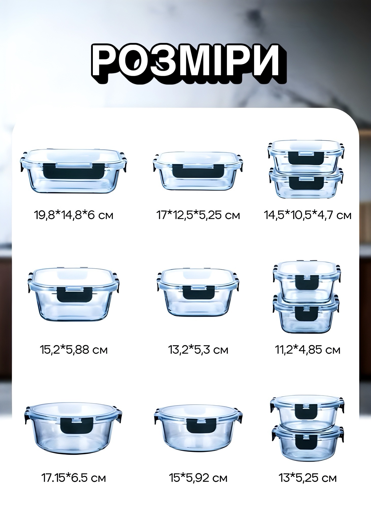 Набір скляних контейнерів для зберігання продуктів, 12 шт (прямокутні та круглі, з герметичними кришками)