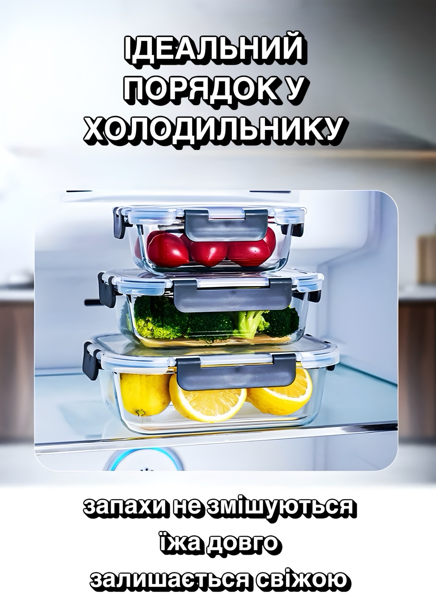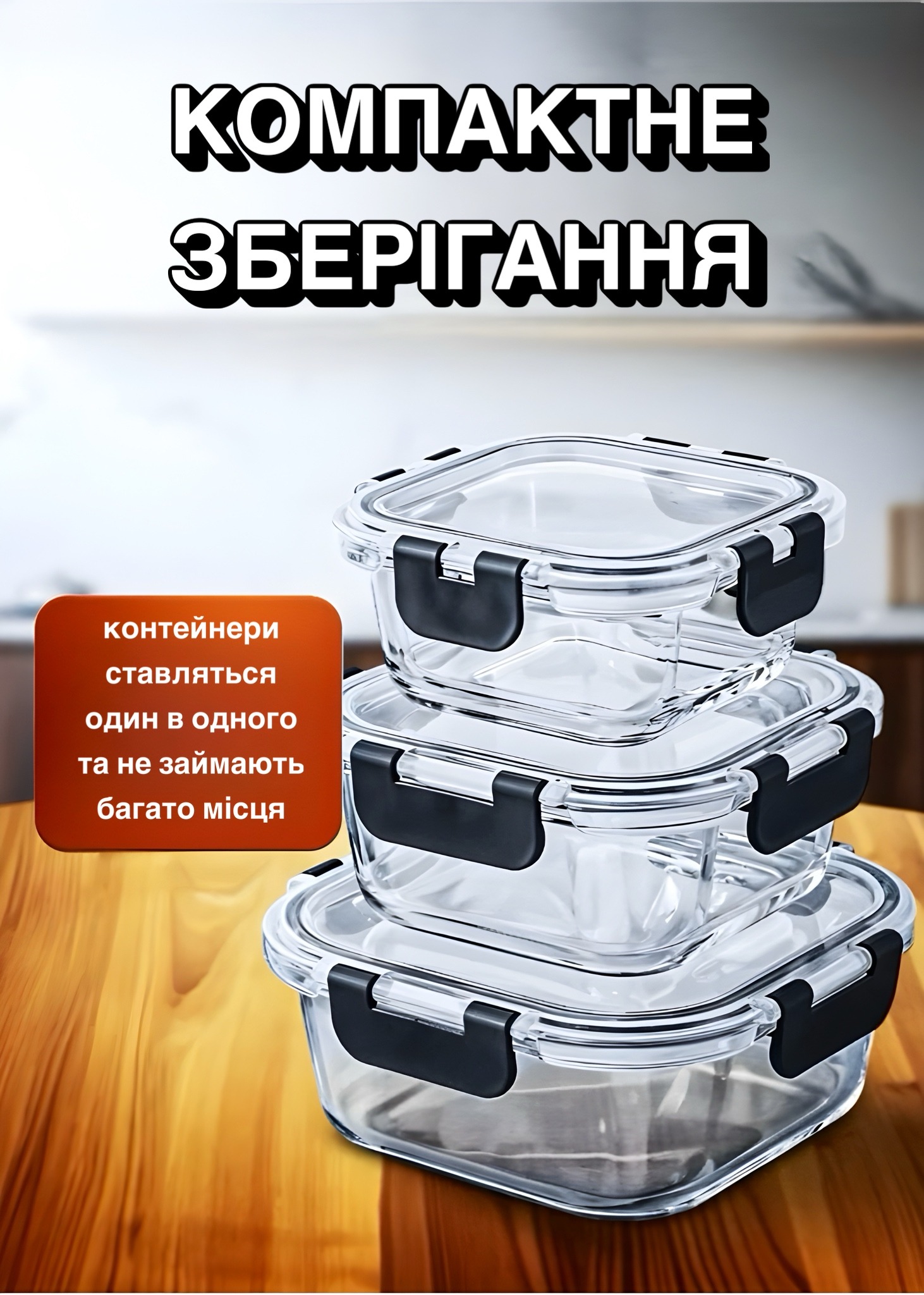Завдяки різним розмірам контейнерів зручно зберігати як невеликі порції, так і повноцінні страви. Прозоре скло дозволяє бачити вміст без відкривання.