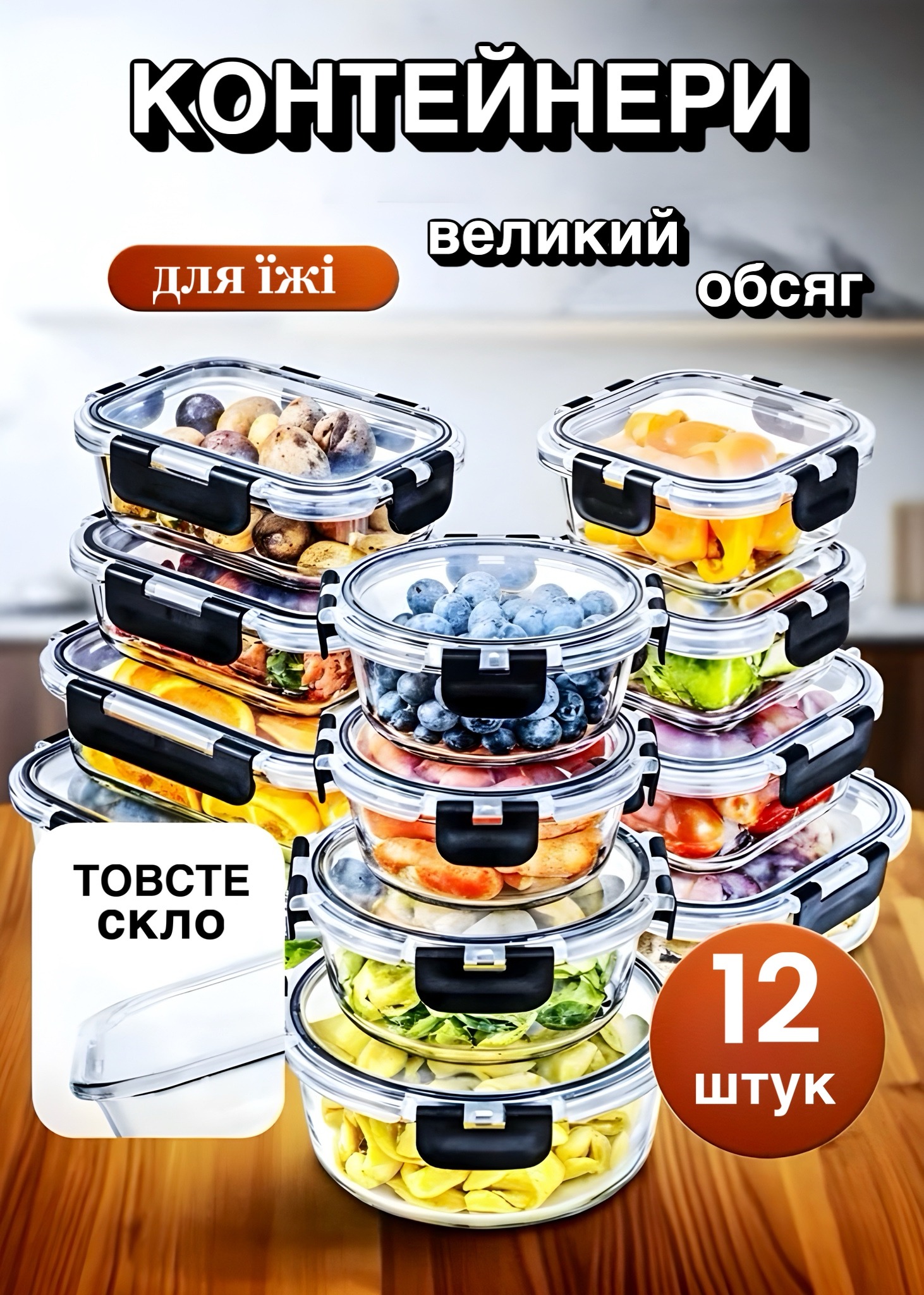 Набір із 12 контейнерів із міцного термостійкого скла — ідеальне рішення для зберігання, заморожування, розігрівання та транспортування продуктів.