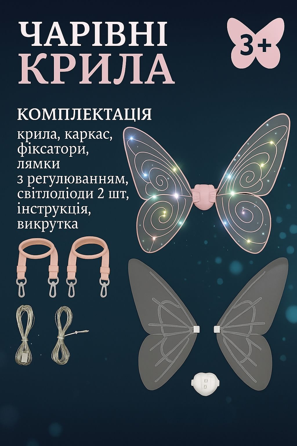 У комплекті — 2 діодні гірлянди, що надягаються на крила