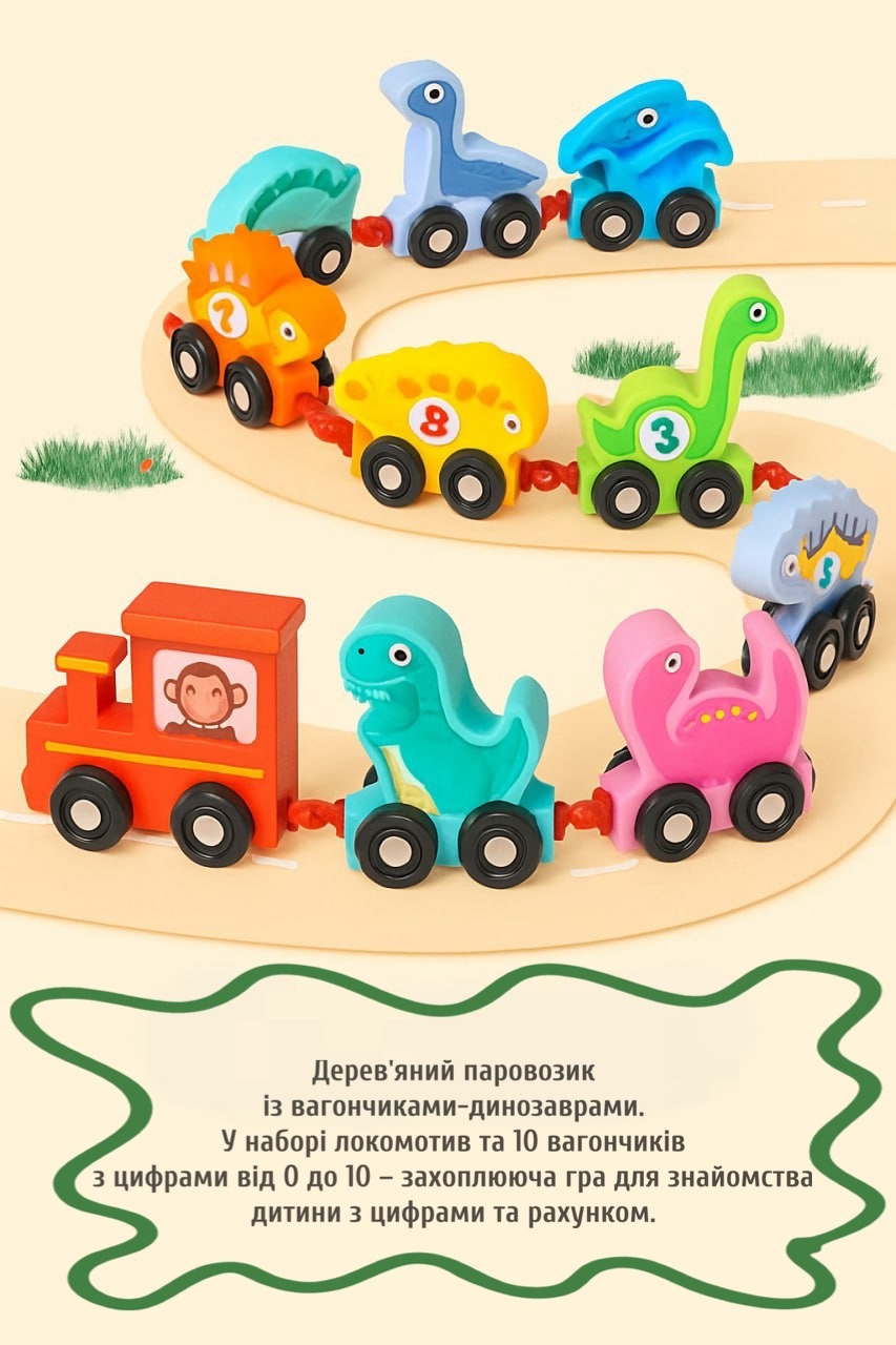 Паровоз складається з яскравого локомотива та 10 вагончиків у вигляді милих динозавриків із цифрами від 1 до 10 (на локомотиві — цифра 0). Така форма гри перетворює вивчення цифр на цікаву пригоду. Дитина може з’єднувати вагончики, розташовувати їх за порядком, рахувати й вивчати кольори — це тренує пам’ять, мислення та сприяє засвоєнню основ лічби.