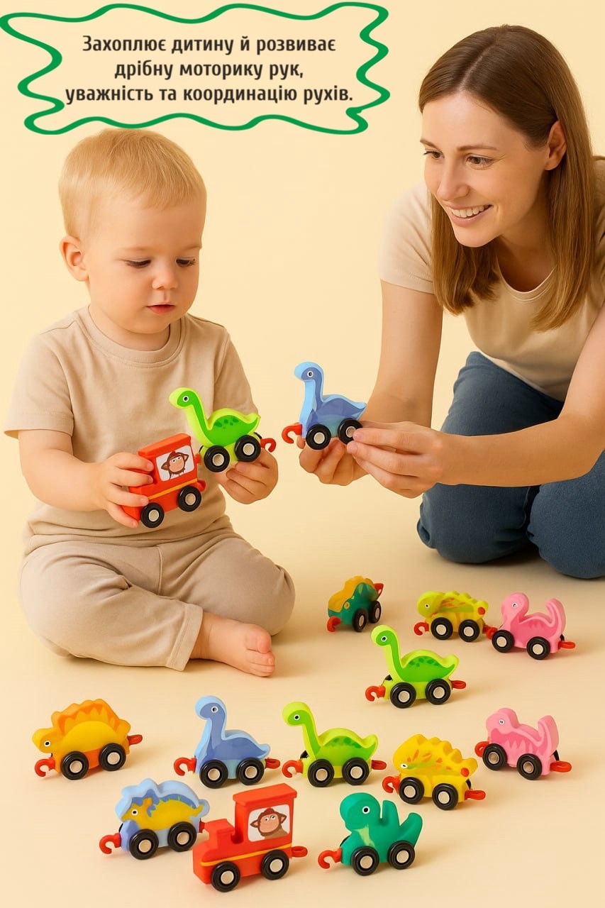 Дерев’яний паровозик із вагончиками у формі динозаврів — це не просто іграшка, а захоплива навчальна гра, яка допомагає дитині розвивати увагу, логіку та дрібну моторику рук.