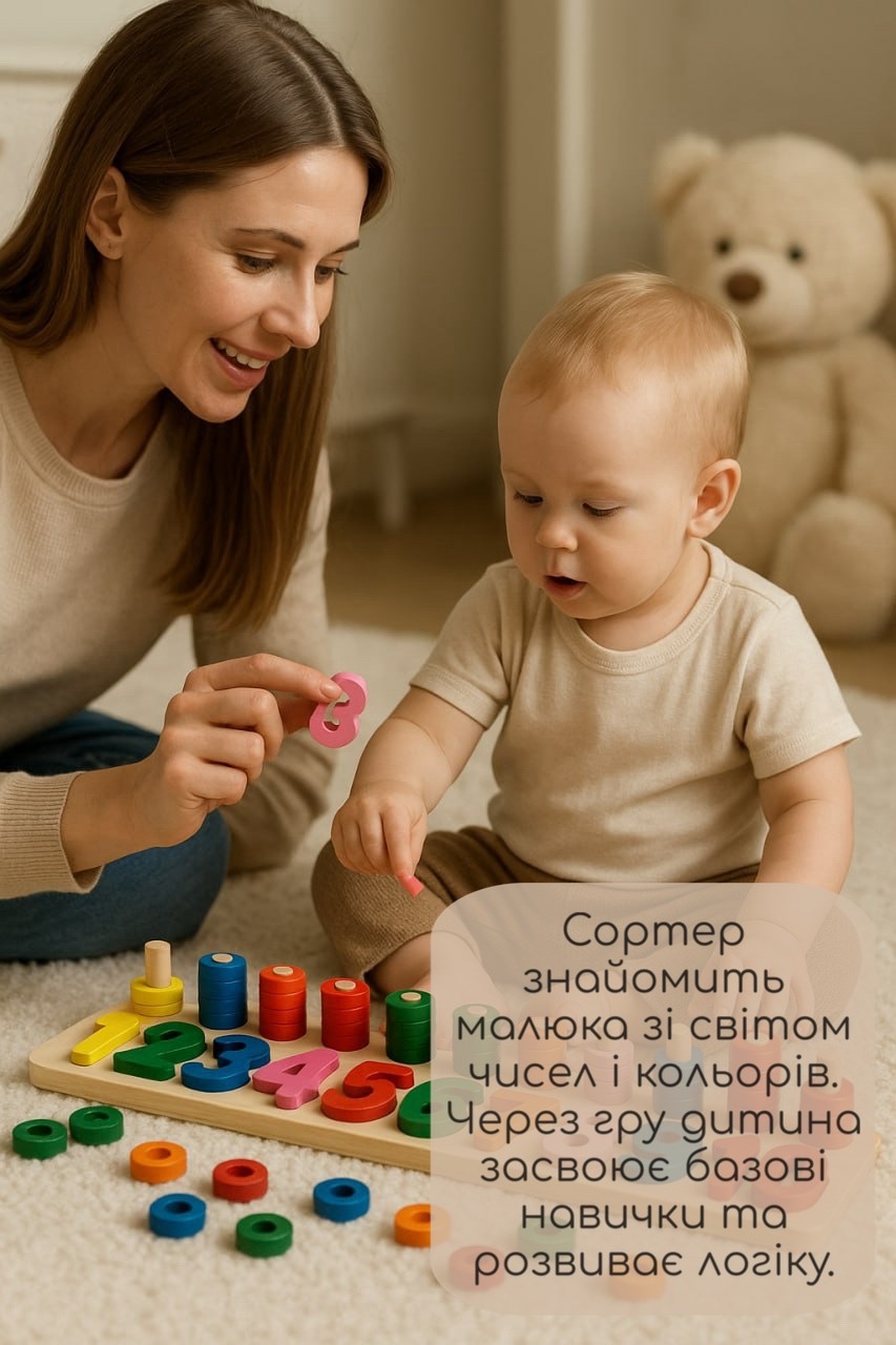 Дерев’яний розвиваючий сортер «Цифри та кольори» — це ідеальна іграшка для перших кроків у навчанні.