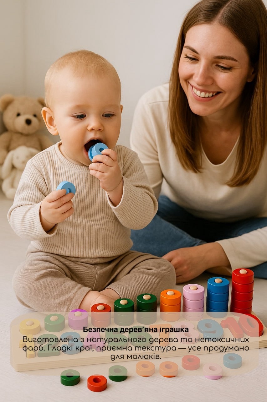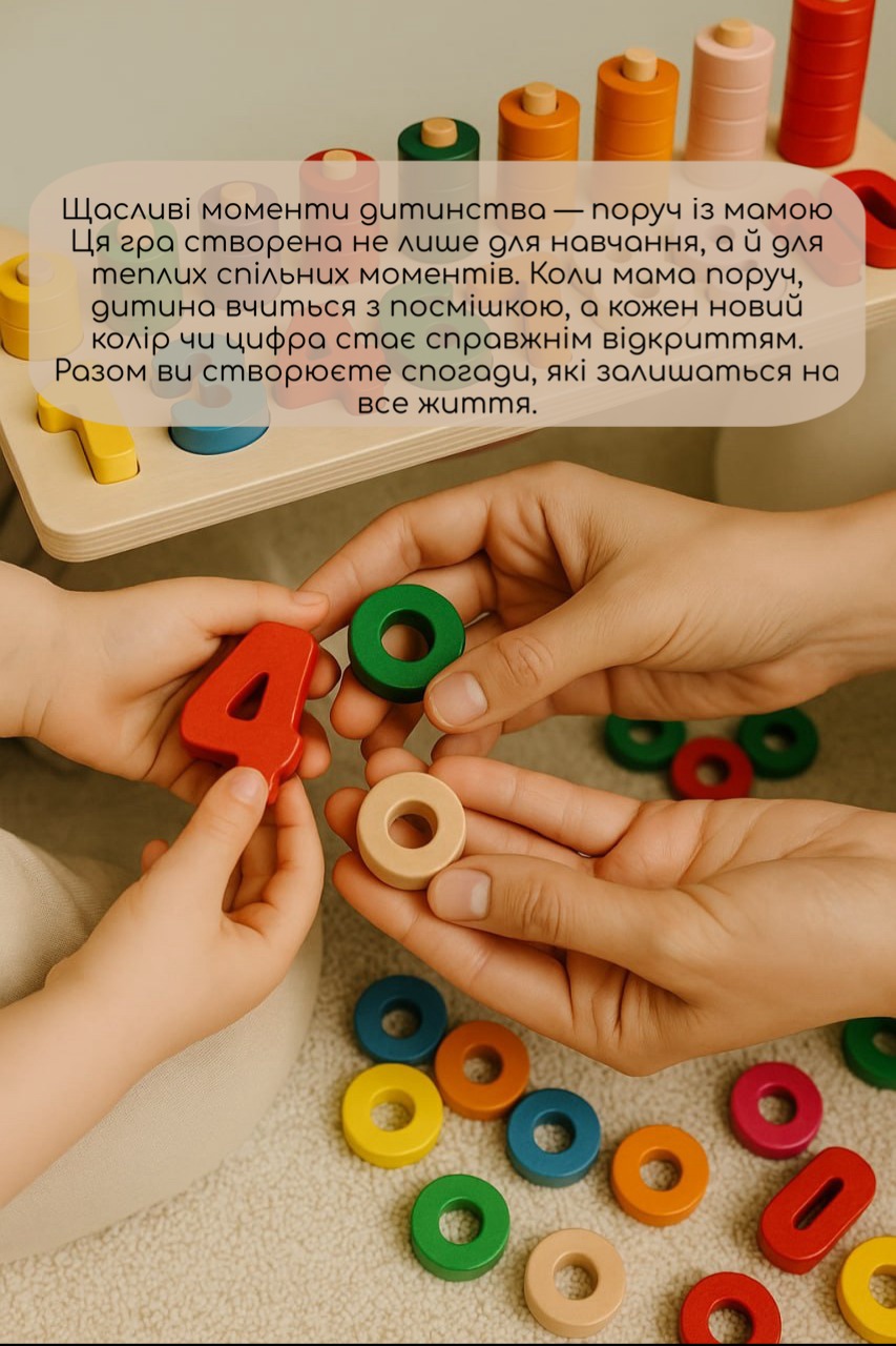 Кожна цифра має свій колір і набір колечок, які допомагають дитині візуально запам’ятовувати послідовність і співставляти елементи.