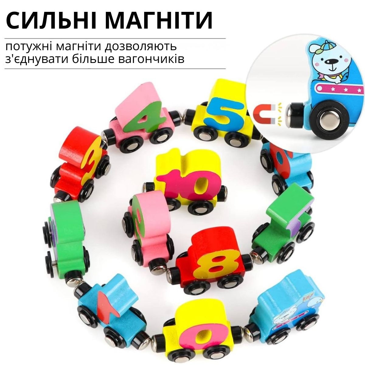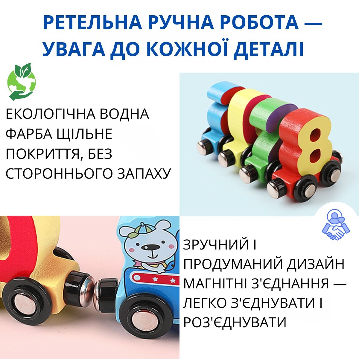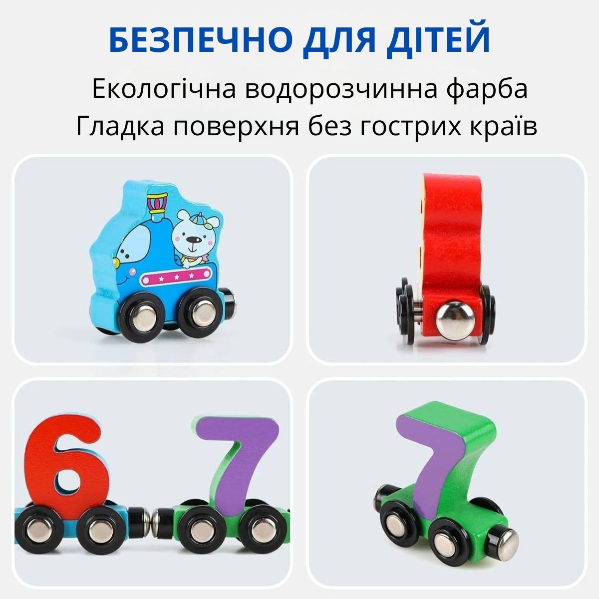 Кожен вагончик прикрашений яскравою цифрою від 0 до 10 та легко з’єднується між собою за допомогою магнітів. Магнітне з'єднання безпечне та зручне — дитина без зусиль зможе приєднувати і від’єднувати вагони, створюючи власні комбінації та послідовності. Завдяки гладкій поверхні та приємним на дотик деталям гра стає ще комфортнішою та цікавішою.