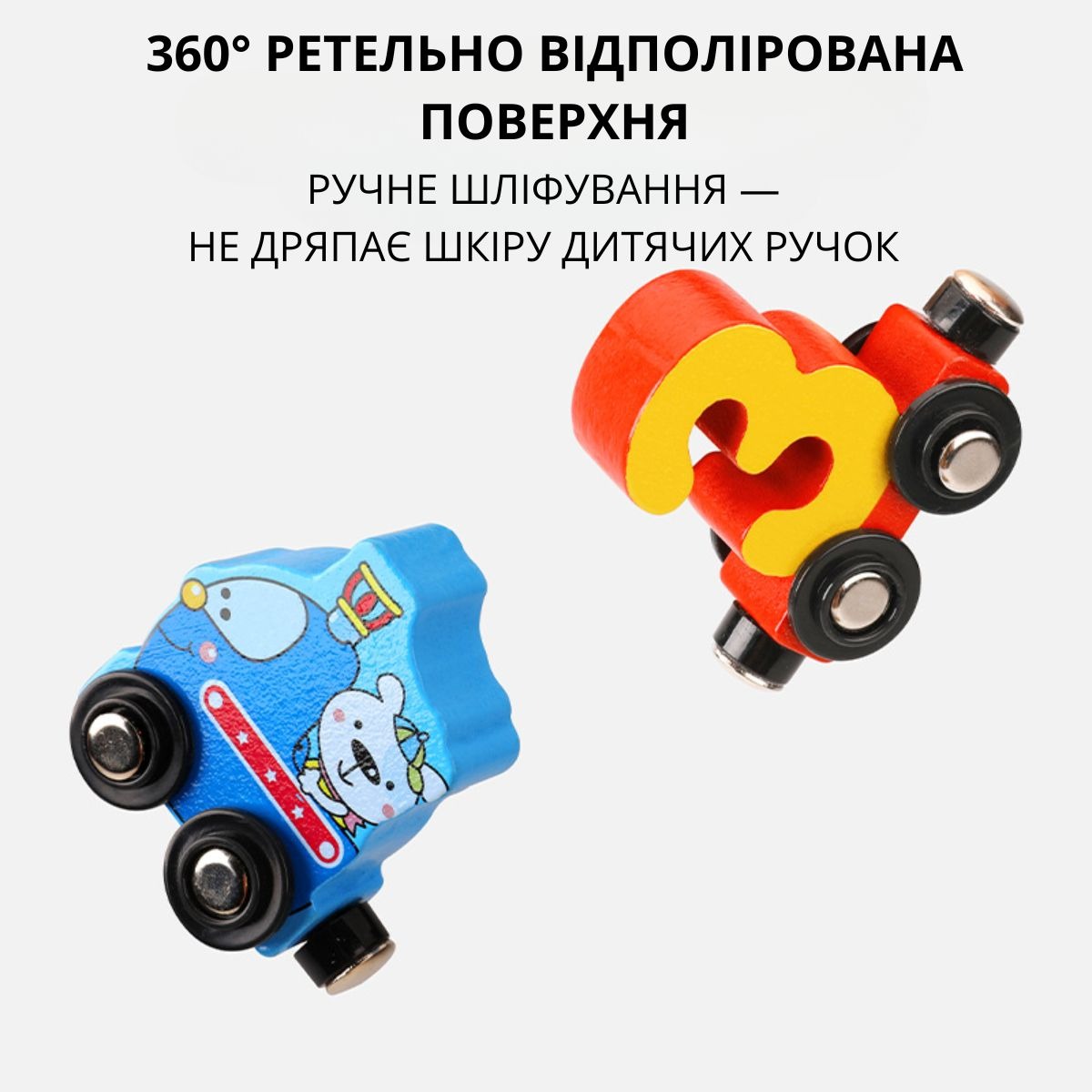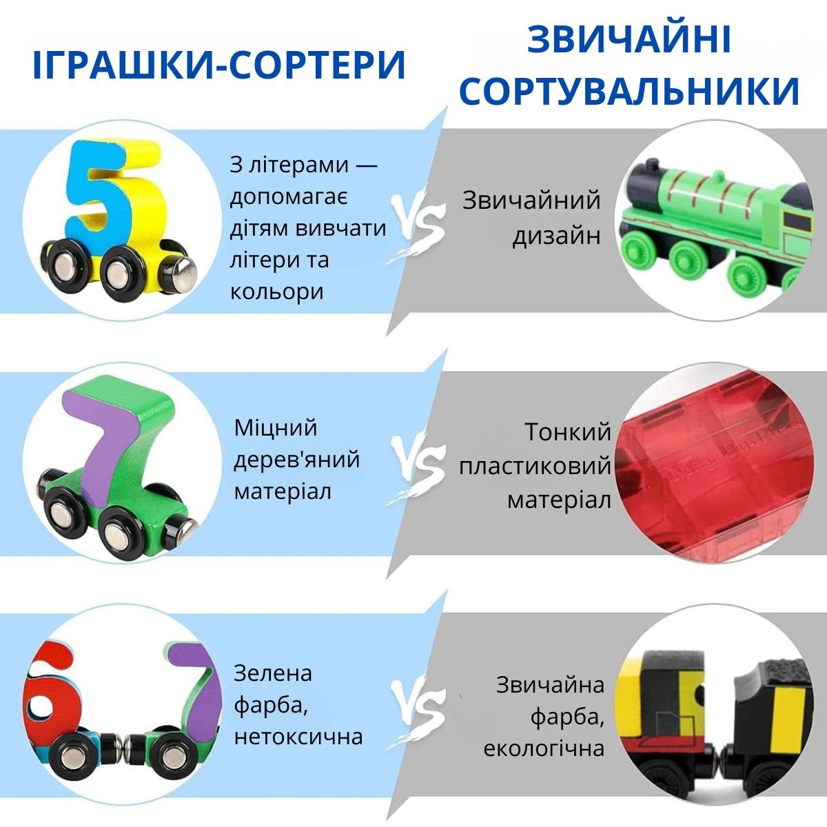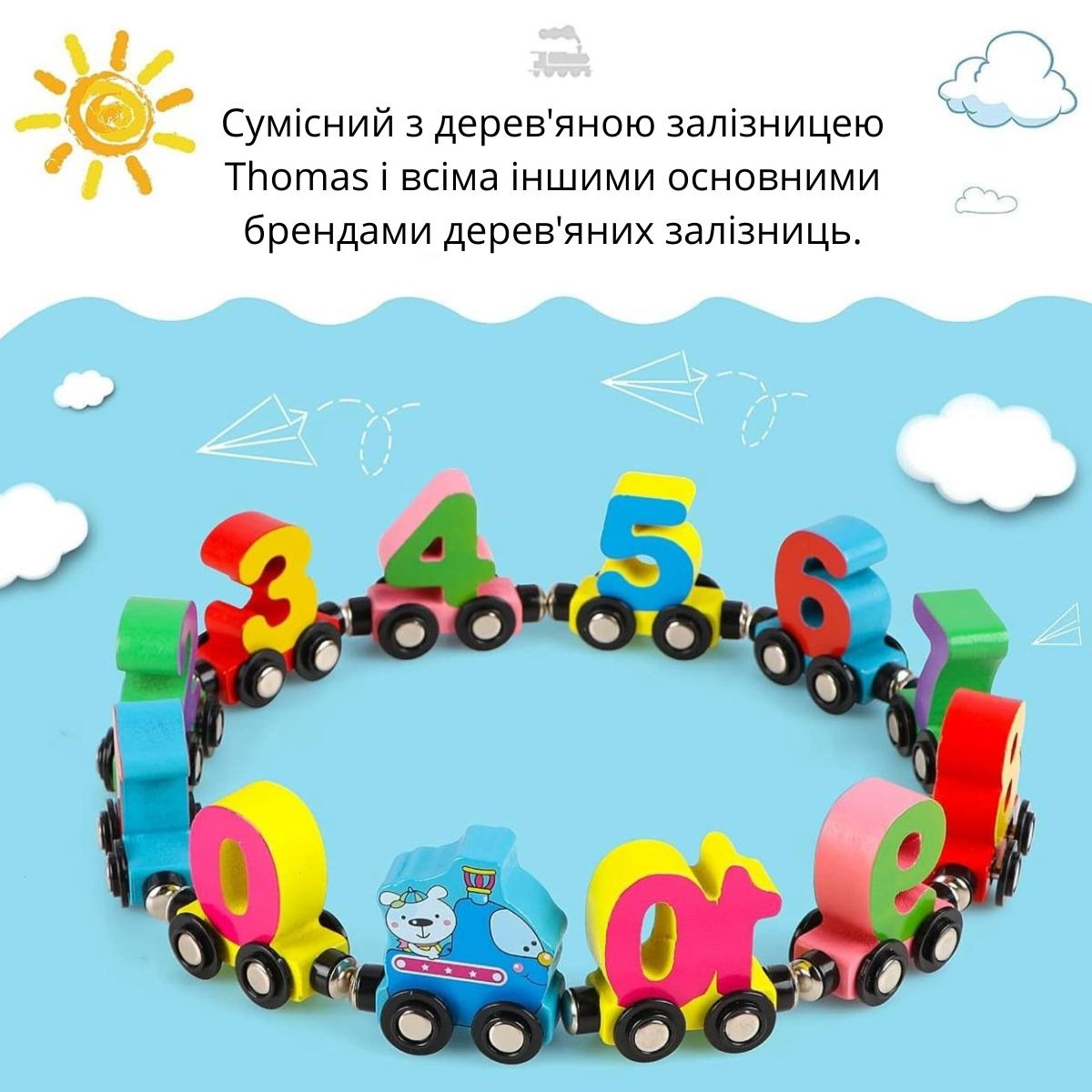 Кожен вагончик прикрашений яскравою цифрою від 0 до 10 та легко з’єднується між собою за допомогою магнітів. Магнітне з'єднання безпечне та зручне — дитина без зусиль зможе приєднувати і від’єднувати вагони, створюючи власні комбінації та послідовності. Завдяки гладкій поверхні та приємним на дотик деталям гра стає ще комфортнішою та цікавішою.