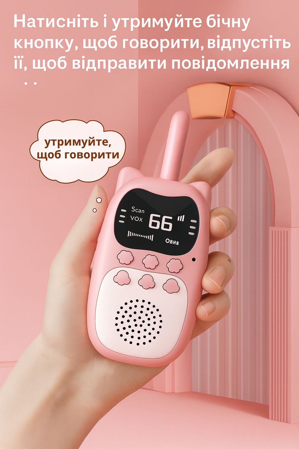 Рація має також компактну підсвітку, яку можна використовувати як ліхтарик — корисна функція у вечірній час або під час подорожей. Привабливий дизайн у вигляді котика робить пристрій не просто засобом зв’язку, а справжнім другом для дитини.