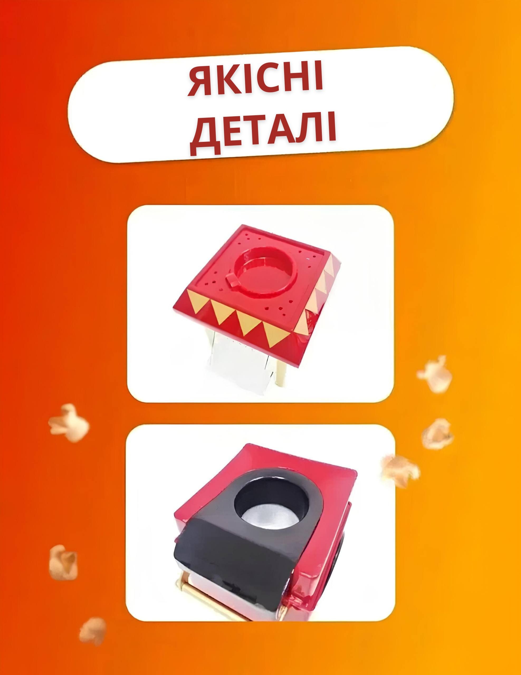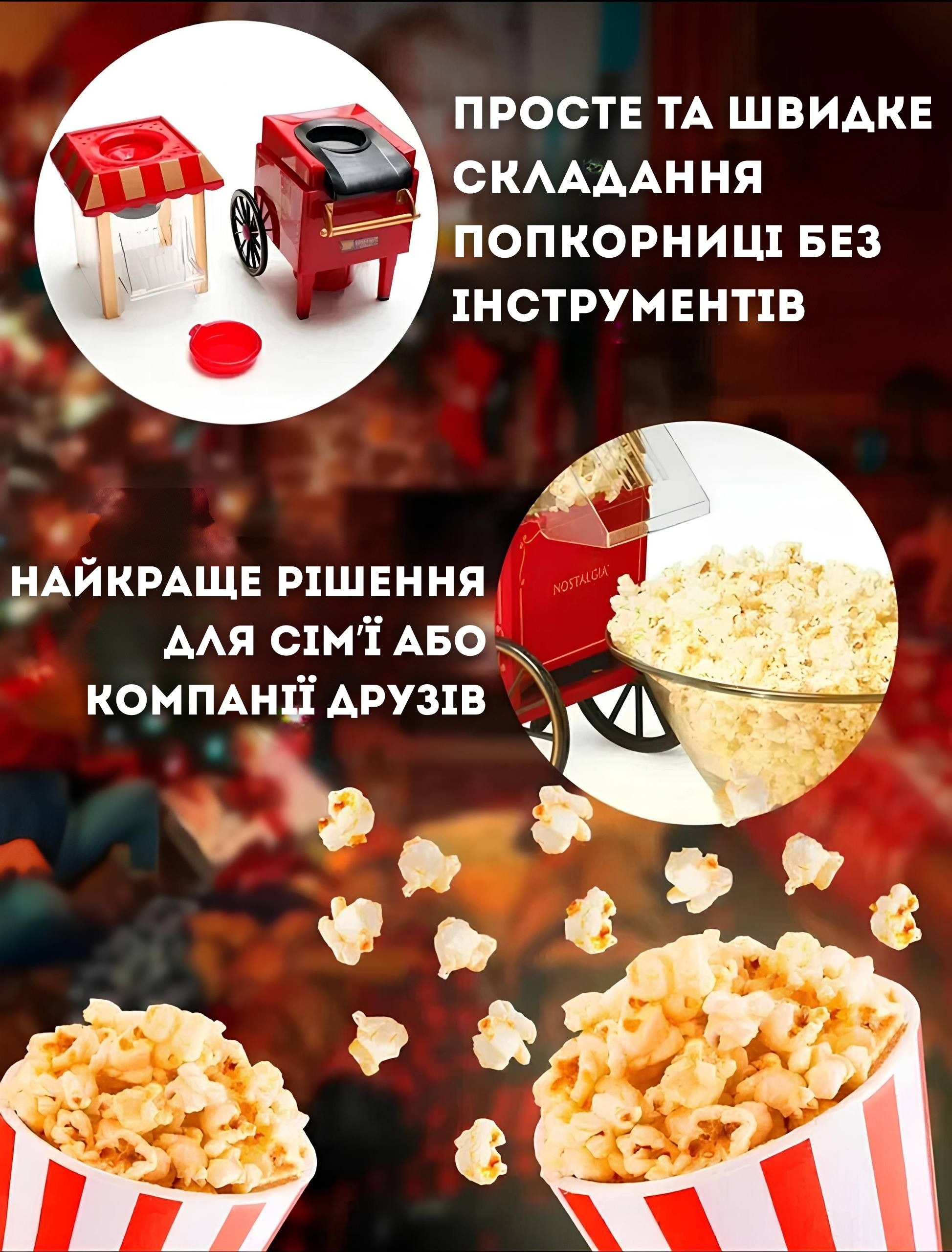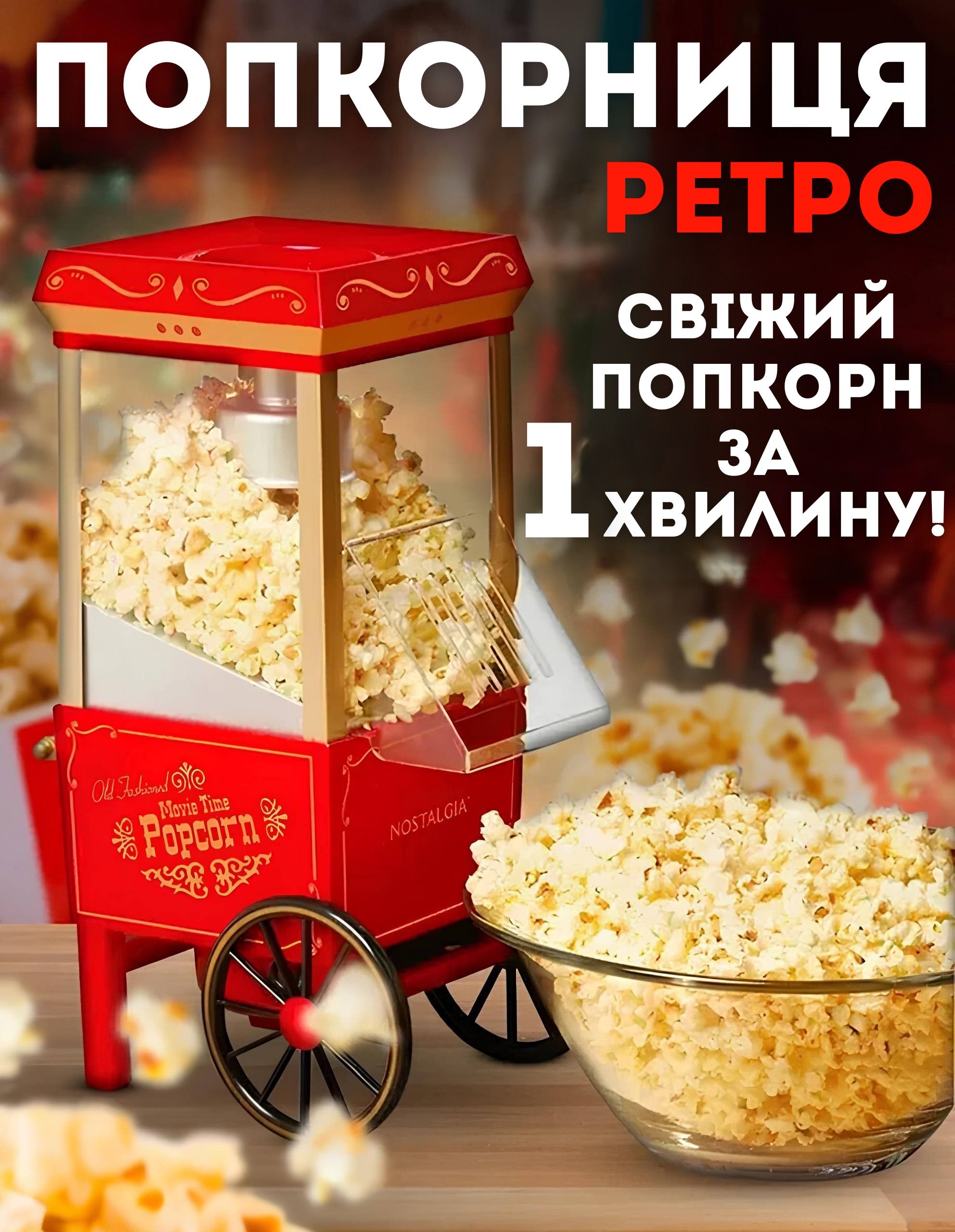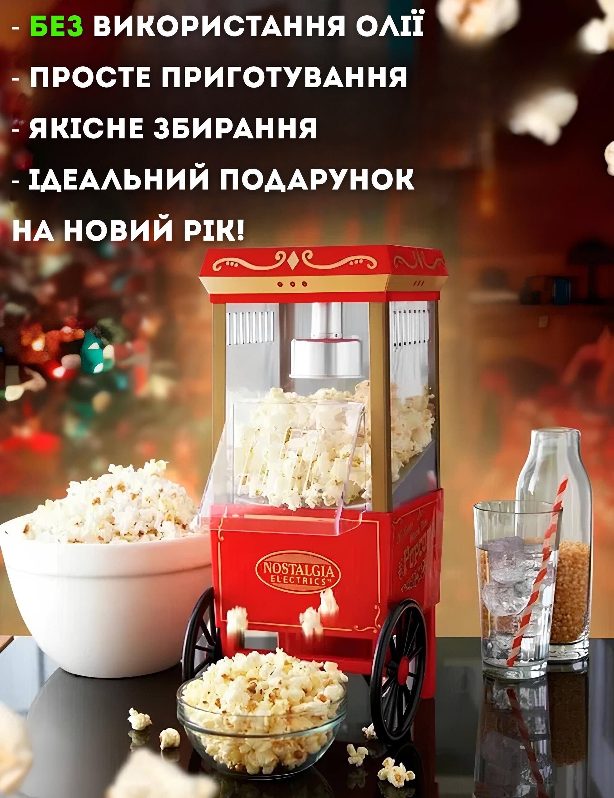 Прилад має стильний дизайн у ретро-стилі, завдяки чому слугує не лише практичним кухонним аксесуаром, а й стає яскравим елементом інтер’єру. Ви можете експериментувати зі смаками: готувати солоний або солодкий попкорн, додавати ваніль, спеції чи улюблені сиропи — усе залежить лише від вашої фантазії.