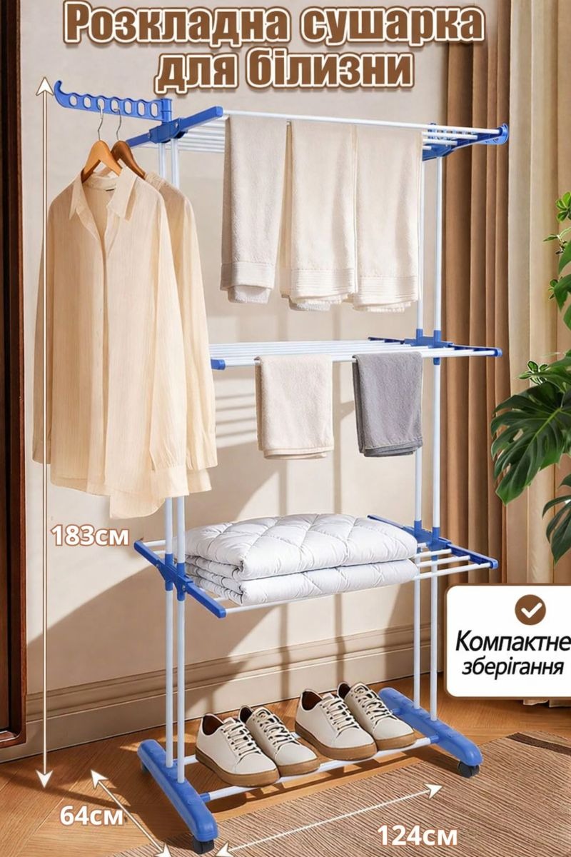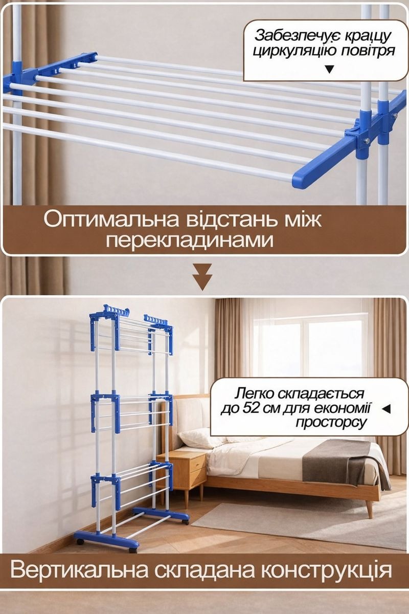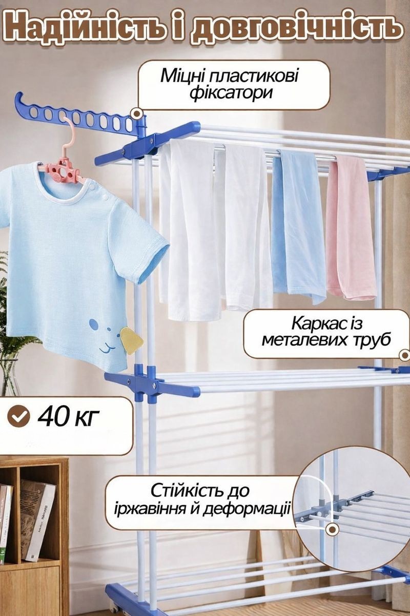Міцний металевий каркас забезпечує стійкість та довгий термін служби, а можливість регулювання полиць дозволяє зручно сушити одяг різного розміру — від дрібної білизни до рушників і навіть взуття.