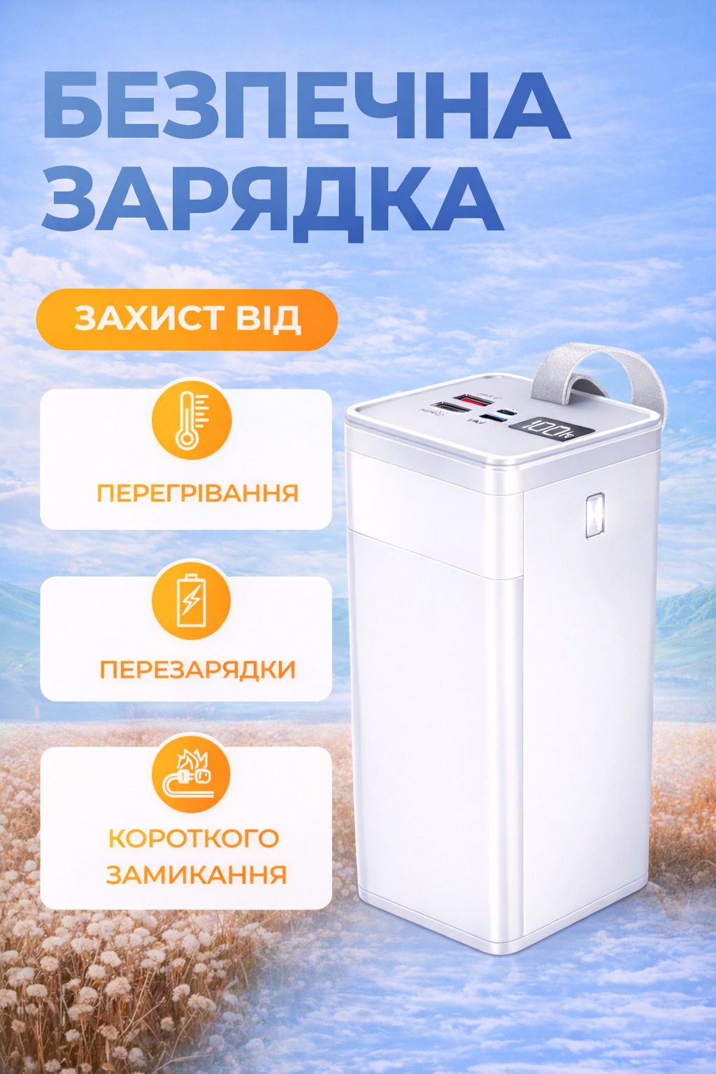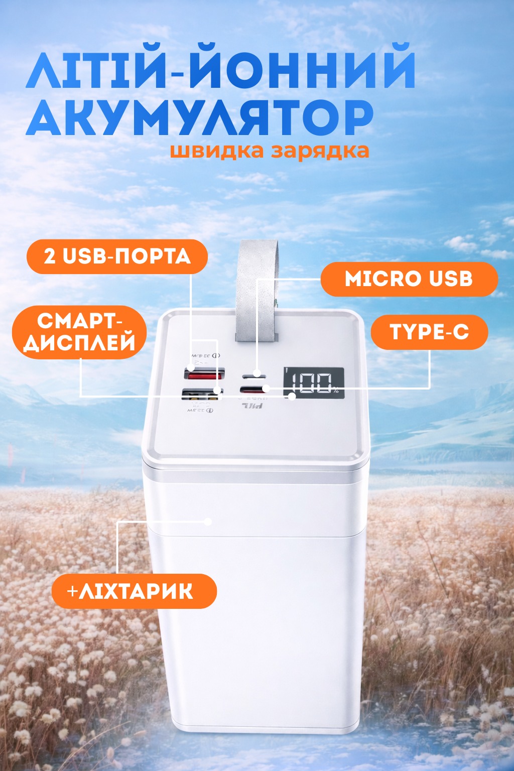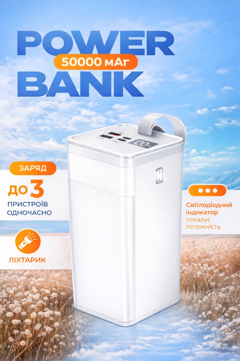 Power Bank 50000mAh 22.5W — це потужне та надійне джерело енергії для ваших пристроїв у будь-яких умовах. Величезна ємність дозволяє багаторазово заряджати смартфони, планшети, навушники, смарт-годинники та інші гаджети без необхідності постійно підзаряджати сам повербанк.
