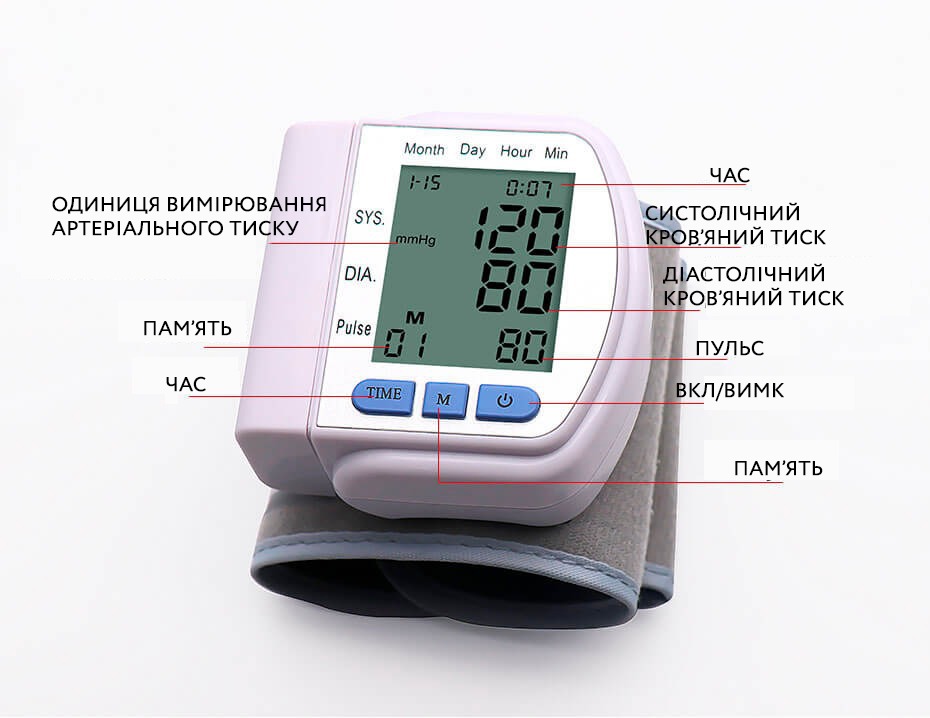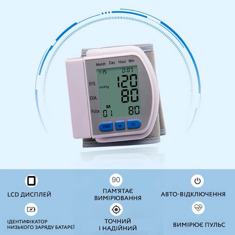 | Спосіб застосування | Вставте батарейки, надягніть манжету на зап’ястя, увімкніть пристрій для вимірювань |