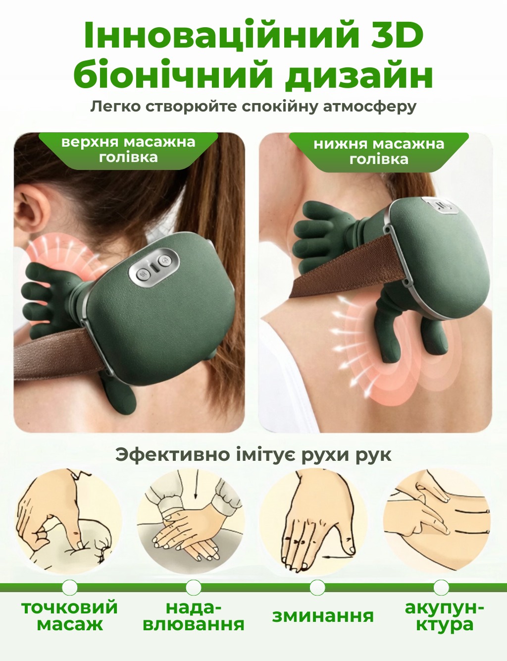- Зона застосування: шия, плечі, спина, поперек, ноги
