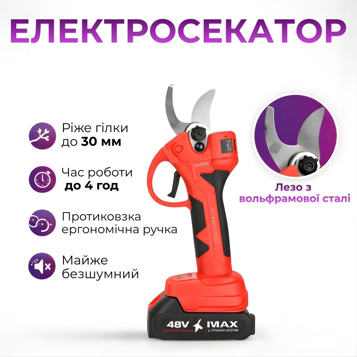 Акумуляторний електросекатор призначений для швидкої та точної обрізки гілок кущів і дерев. Гостре лезо з вольфрамової сталі забезпечує чистий зріз без пошкодження деревини. Інструмент практично безшумний, зручно лежить у руці завдяки протиковзкій рукоятці та дозволяє працювати до 4 годин на одному заряді.