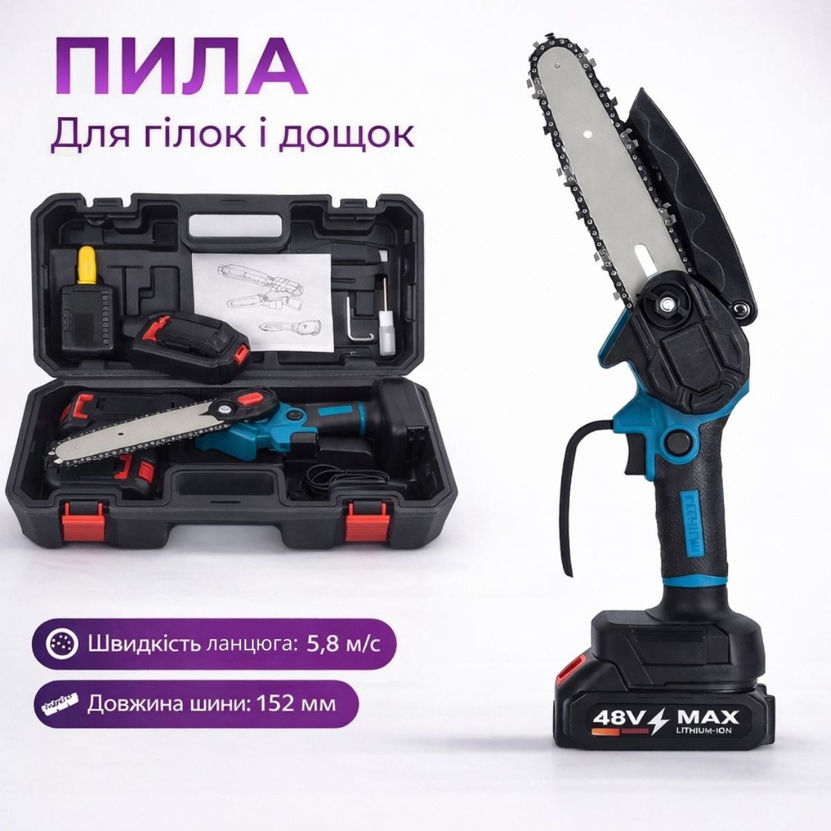 Акумуляторна ланцюгова мініпила призначена для розпилювання гілок, дощок і кущів. Компактний розмір і невелика вага дозволяють працювати навіть у важкодоступних місцях. Ідеально підходить для садових і столярних робіт.