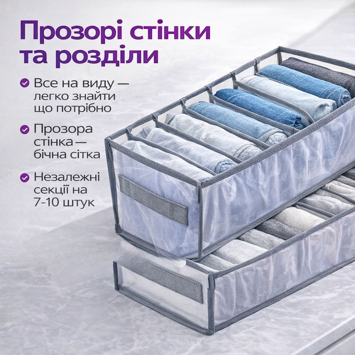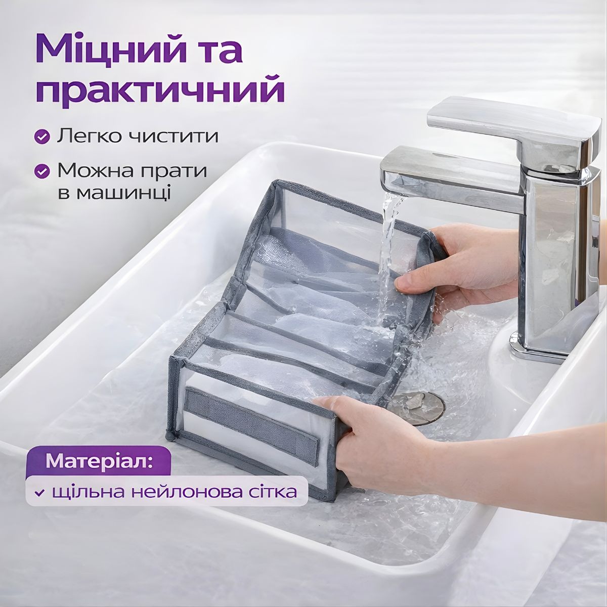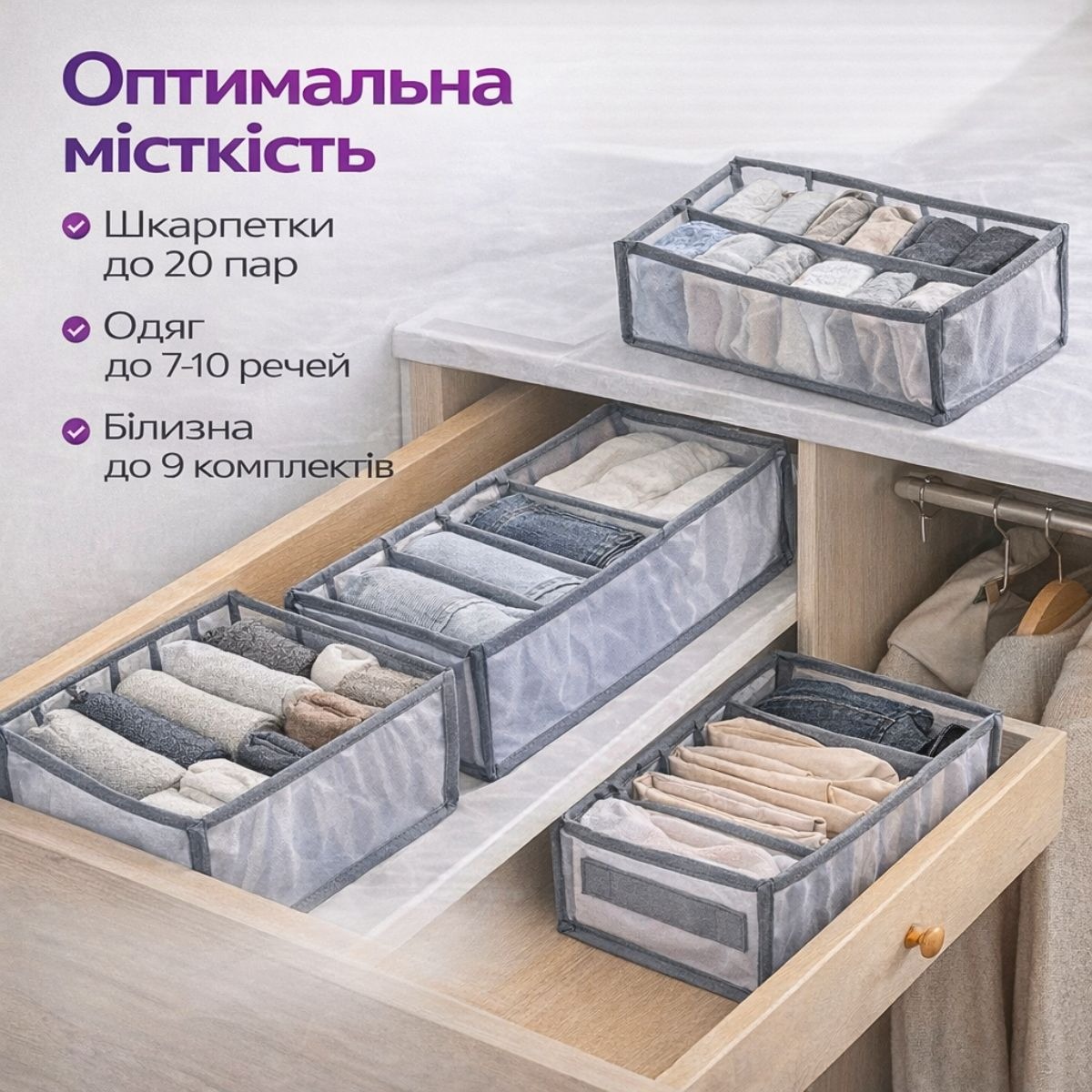 Конструкція дозволяє компактно зберігати речі, а за потреби переміщати органайзер повністю. Підходить для зберігання білизни, футболок, шортів, легінсів, аксесуарів та інших предметів гардероба.