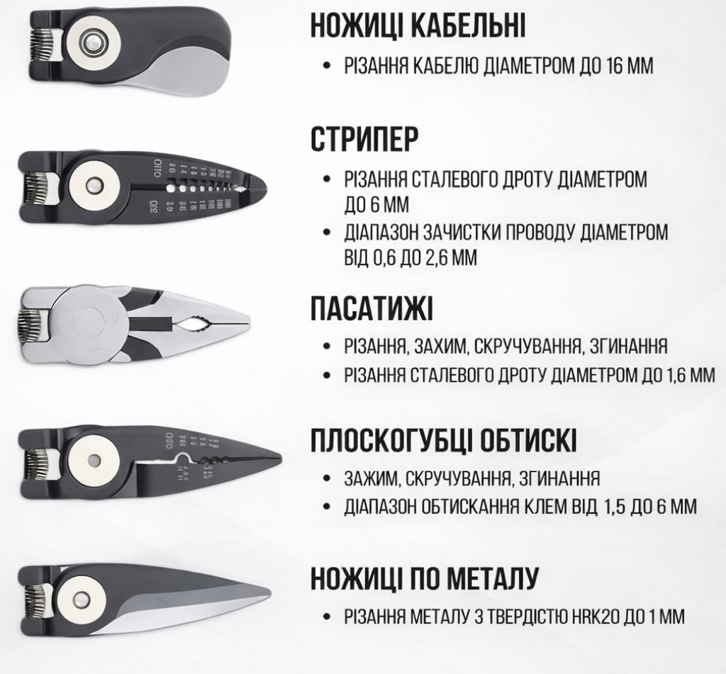 - Призначення: різання кабелів, зняття ізоляції, обтиск, захоплення та утримання