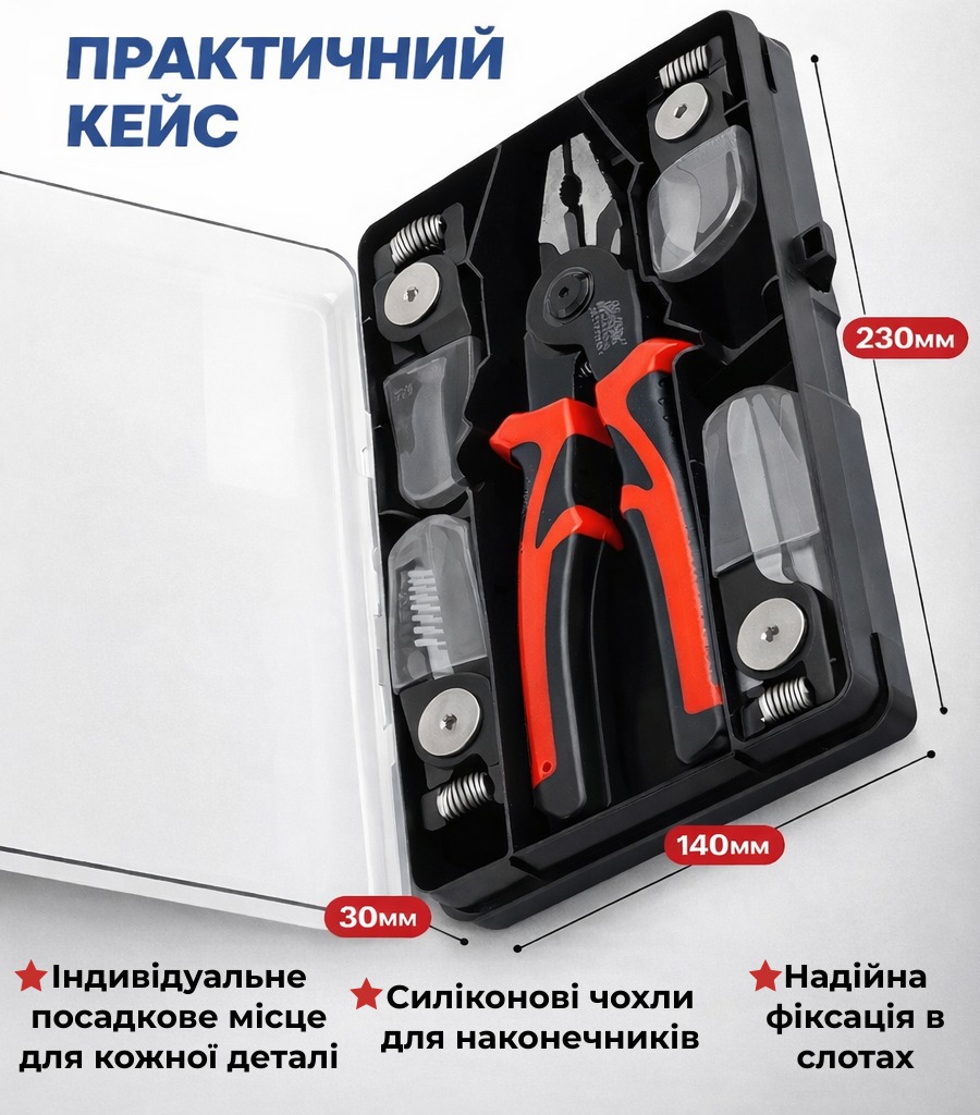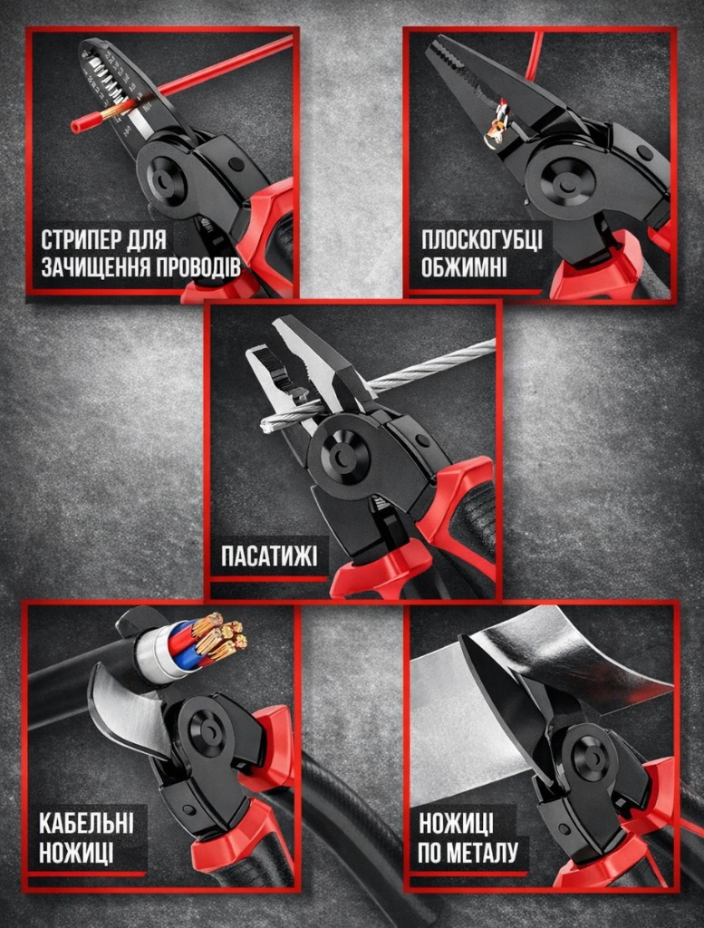 Універсальний набір 5 в 1 — це практичне рішення для майстрів, електриків і домашнього використання. Завдяки системі швидкої заміни насадок один інструмент легко адаптується під різні завдання: обтиск контактів, різання кабелю, зняття ізоляції та роботу з металом.