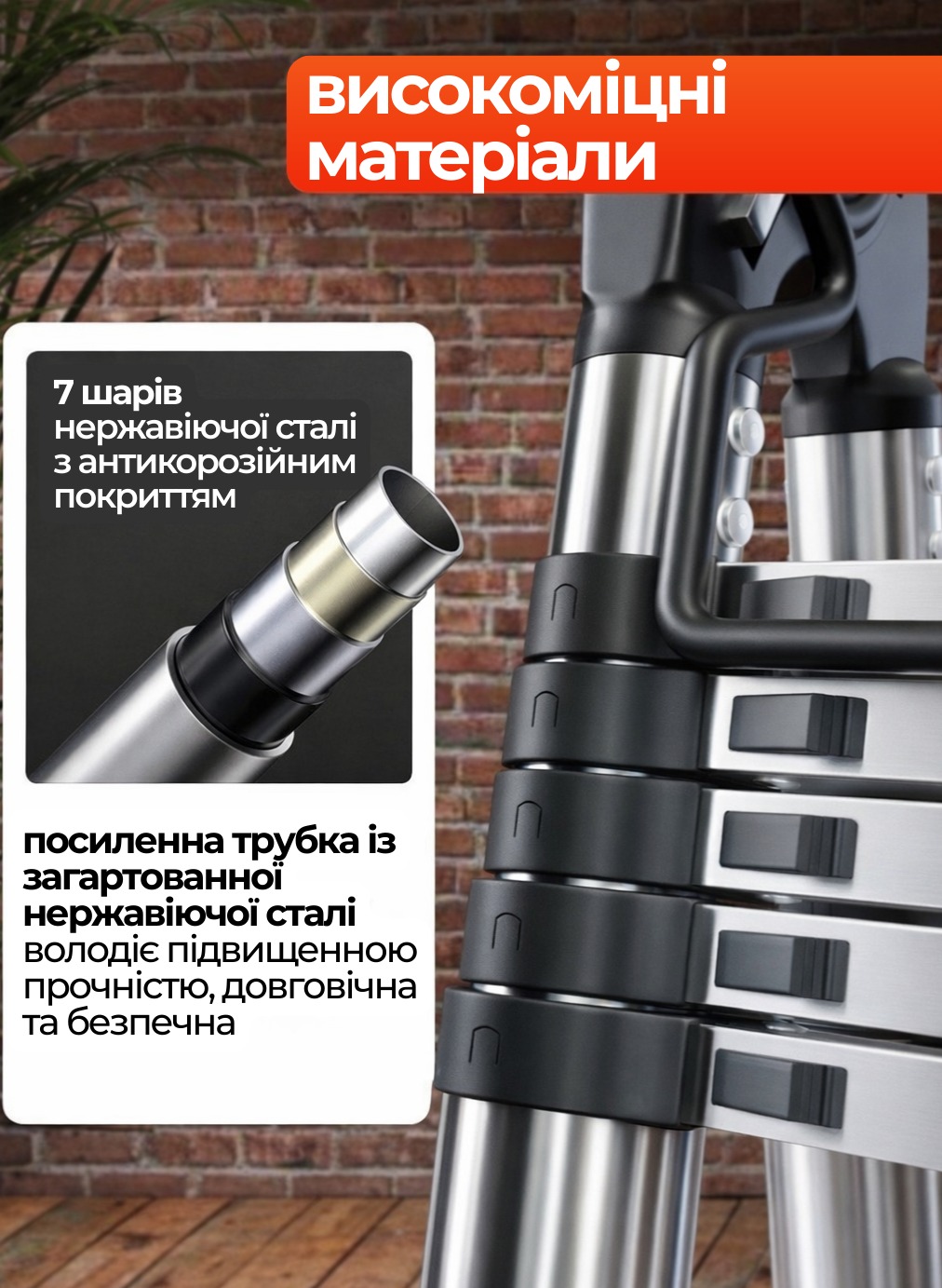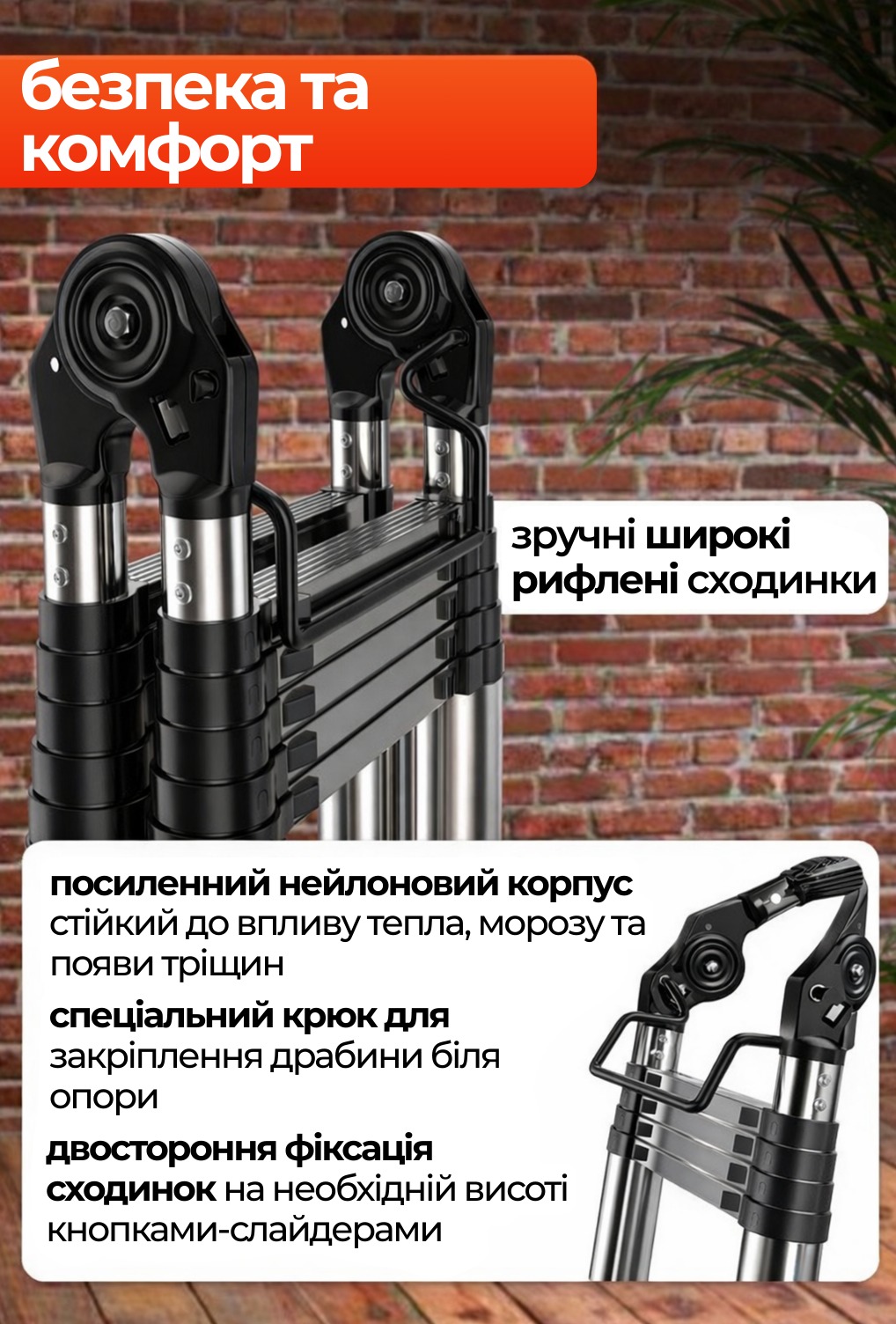 Міцна сталева конструкція гарантує стійкість і безпеку навіть при інтенсивному використанні. Компактні розміри у складеному вигляді дозволяють зручно зберігати драбину в квартирі, гаражі або автомобілі.