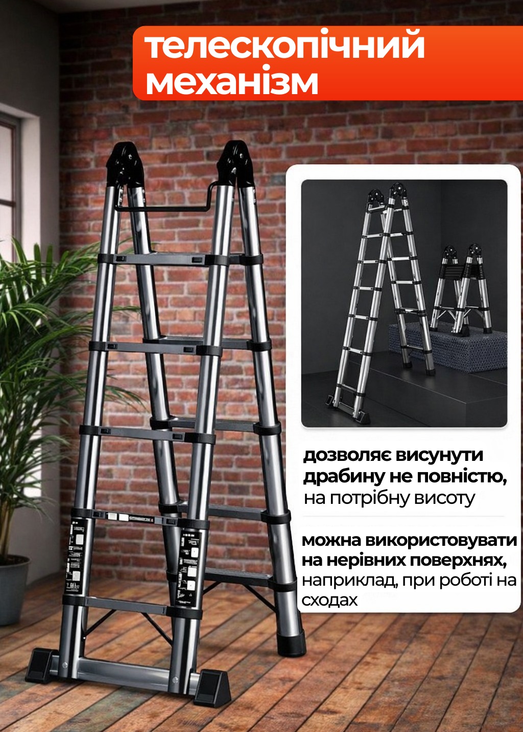 Телескопічна шарнірна драбина — це універсальне рішення для дому, ремонту та професійного використання. Завдяки продуманій конструкції вона легко трансформується у різні положення: класичну драбину (А-подібну), приставну або компактний варіант для зберігання.
