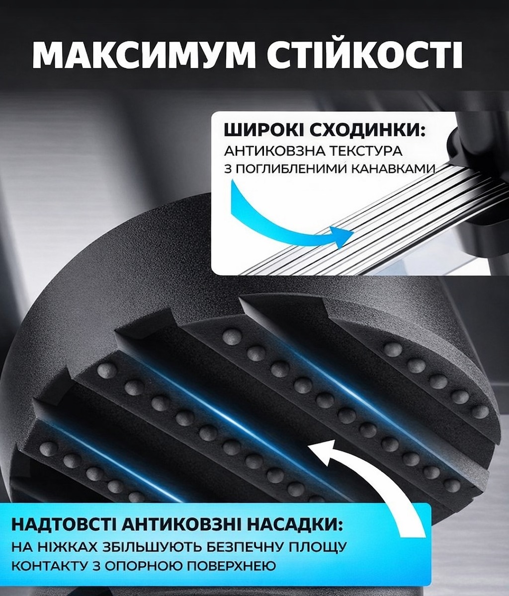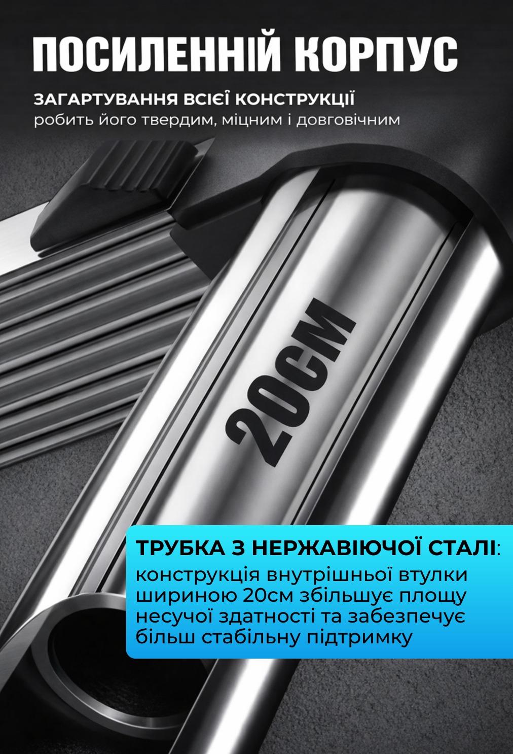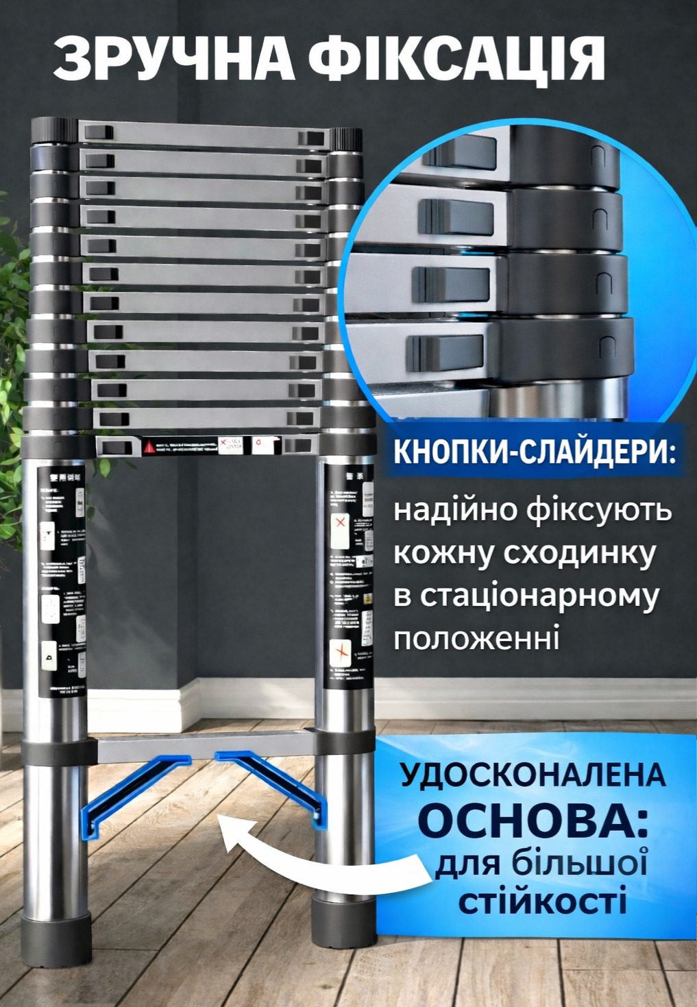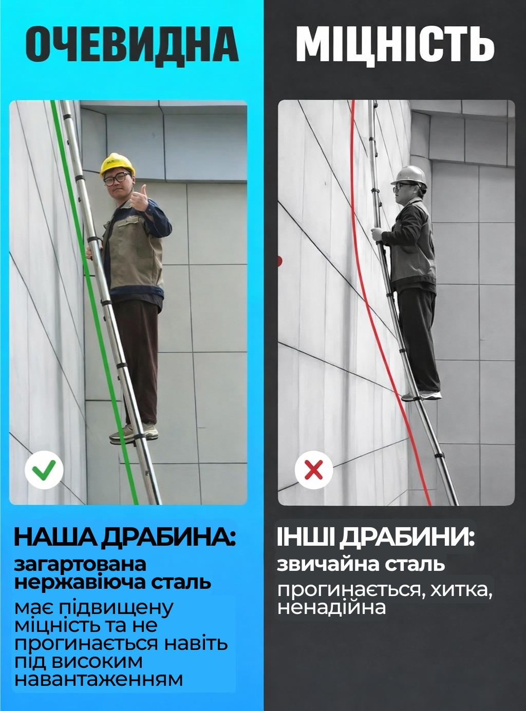 Виготовлена з нержавіючої сталі, драбина відрізняється підвищеною міцністю та довговічністю. Вона стійка до корозії, механічних пошкоджень та витримує інтенсивне використання. Надійні фіксатори забезпечують безпечну фіксацію кожної секції, а антиковзкі сходинки додають комфорту та впевненості під час роботи.