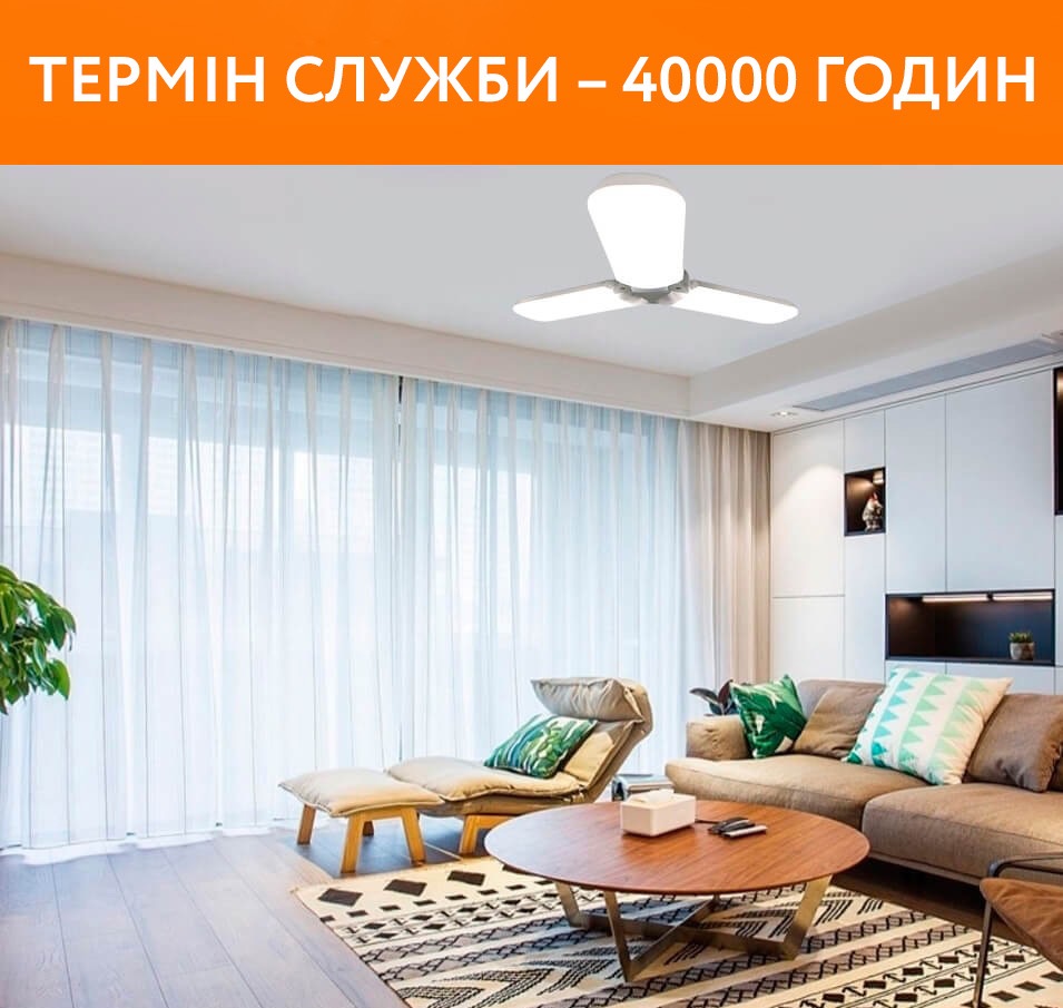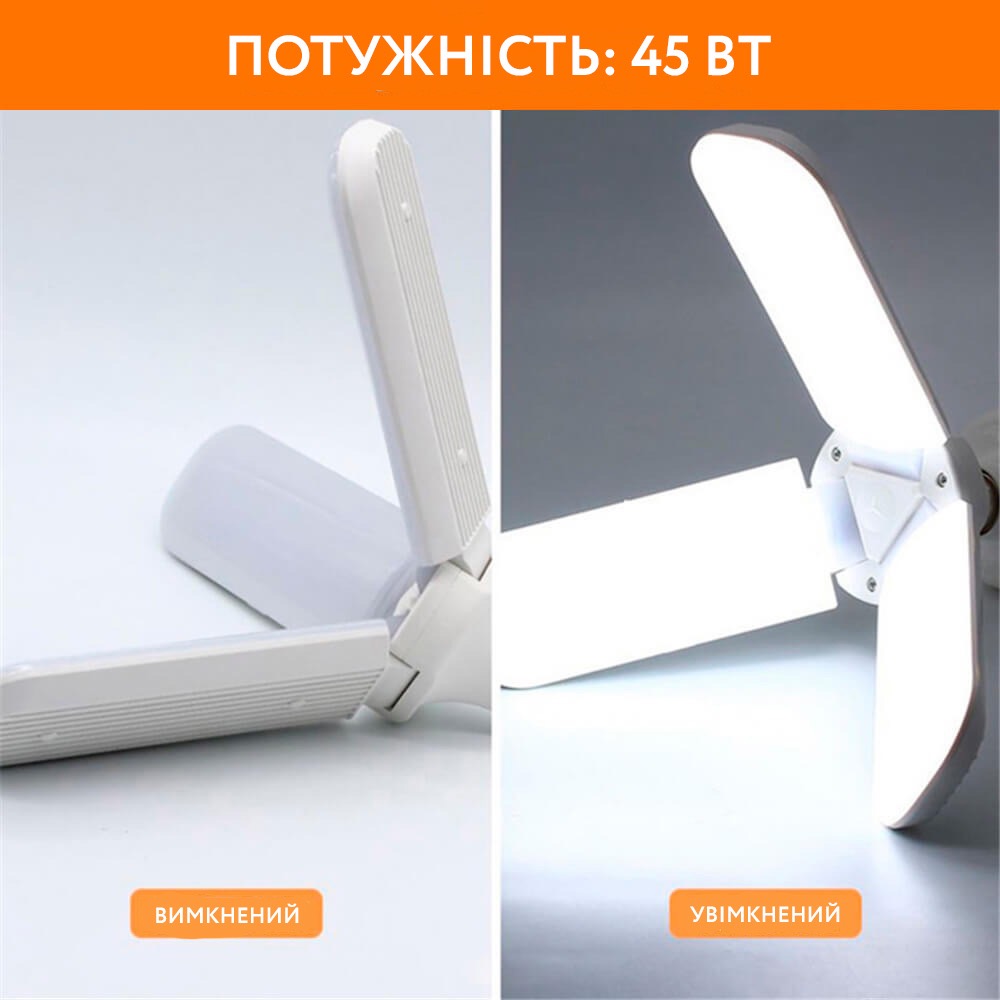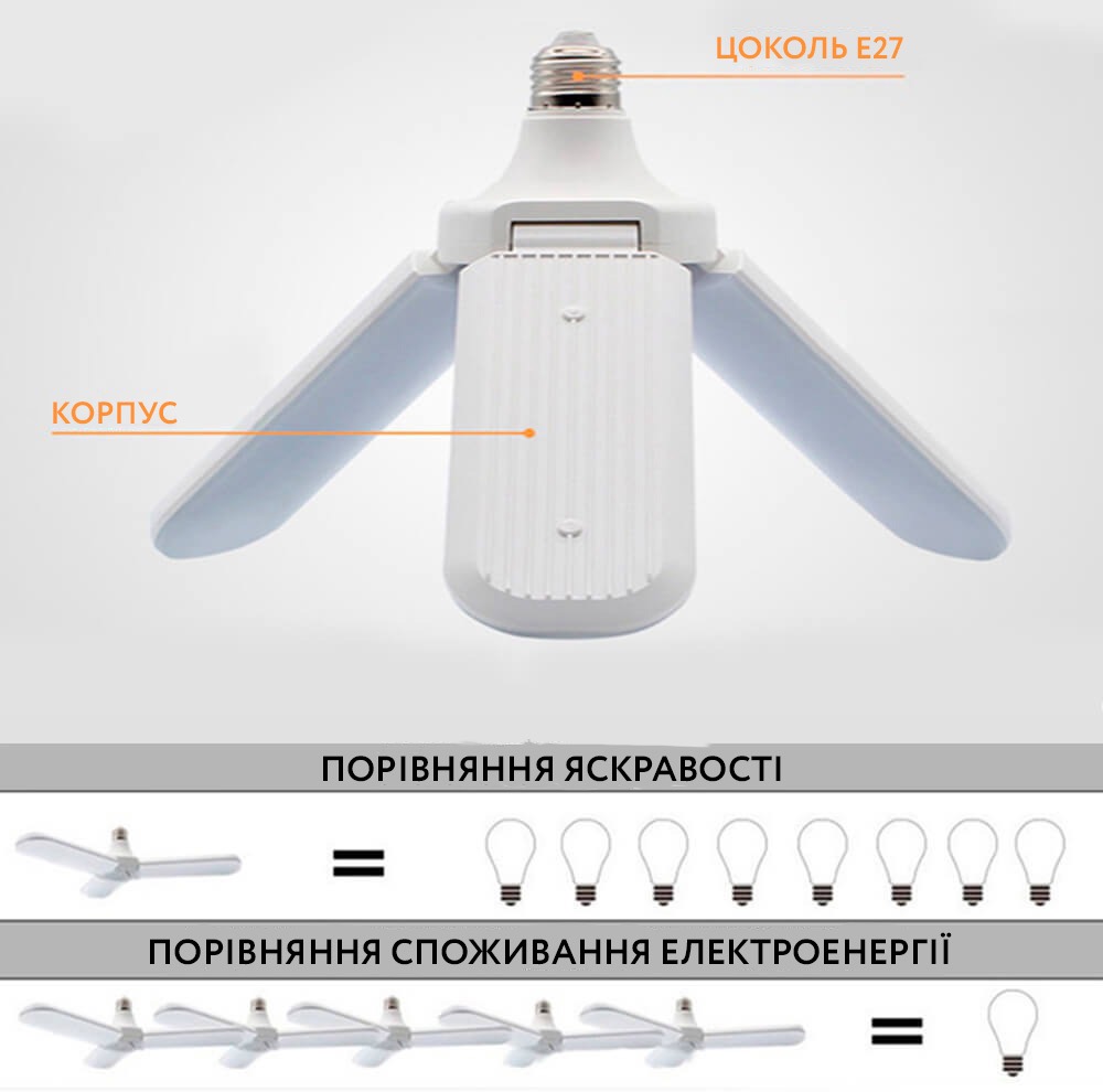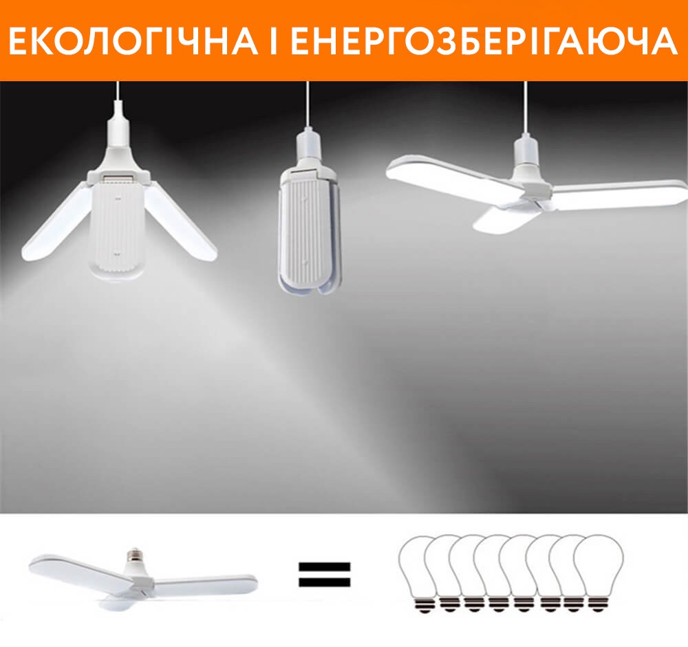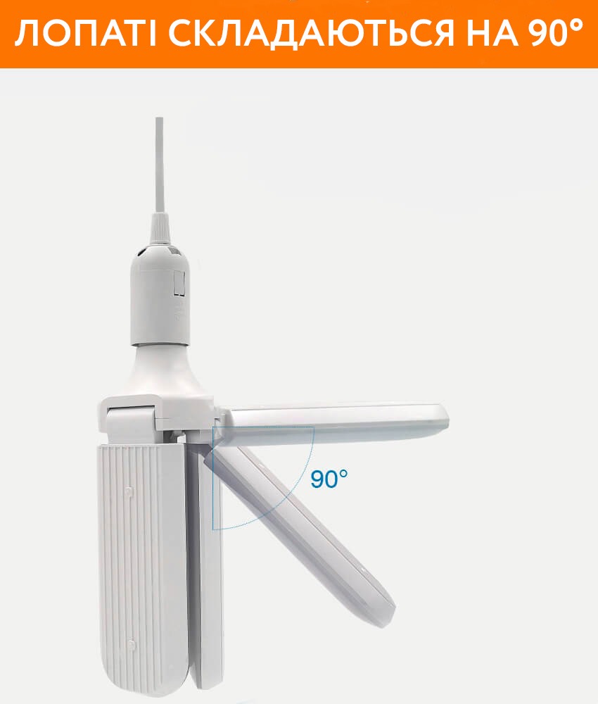 Складна світлодіодна лампа виконана у формі вентилятора (3 лопаті) виглядає просто, елегантно та красиво.