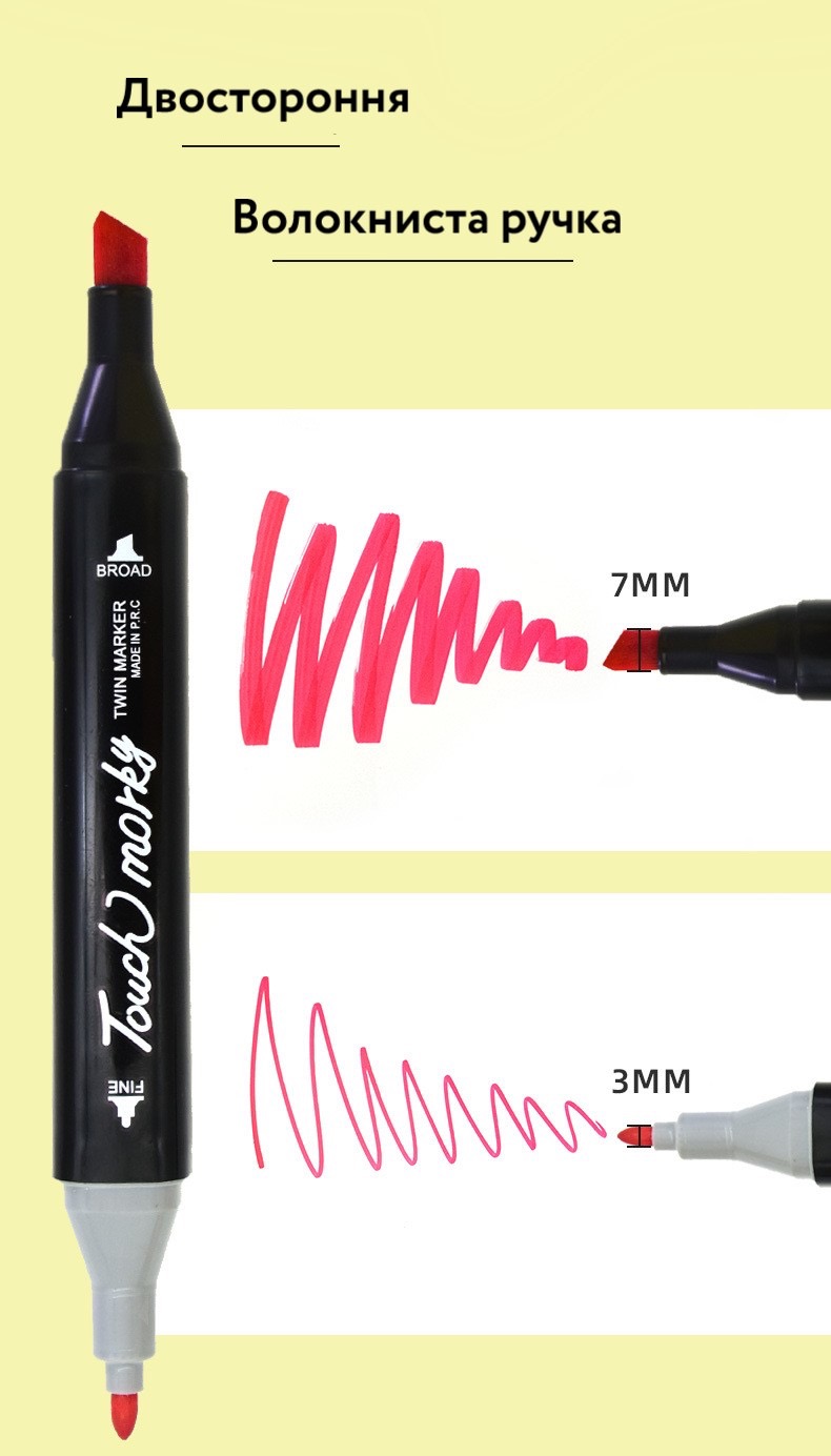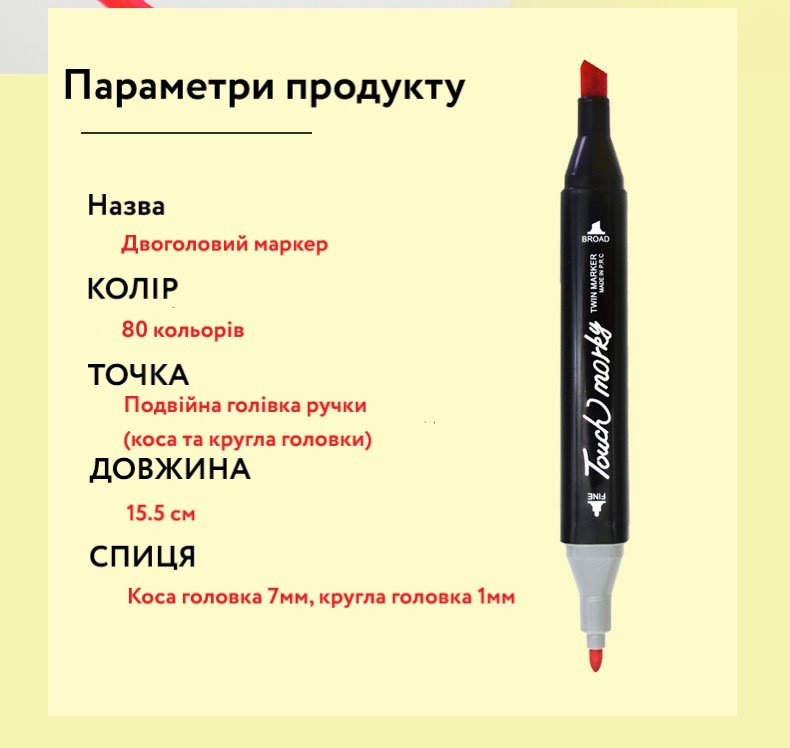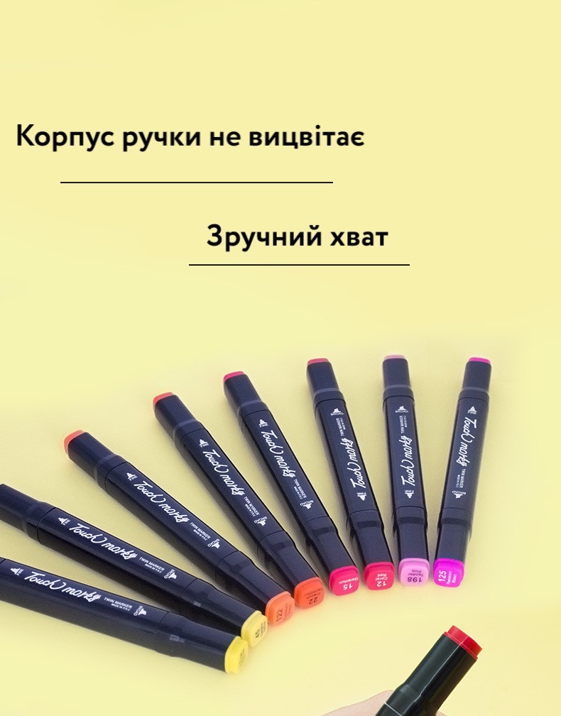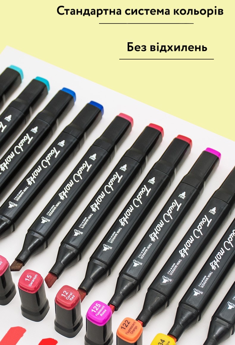 | Особливості | Швидко висихають, два наконечники для різних типів робіт, колір і номер вказані на ковпачку |