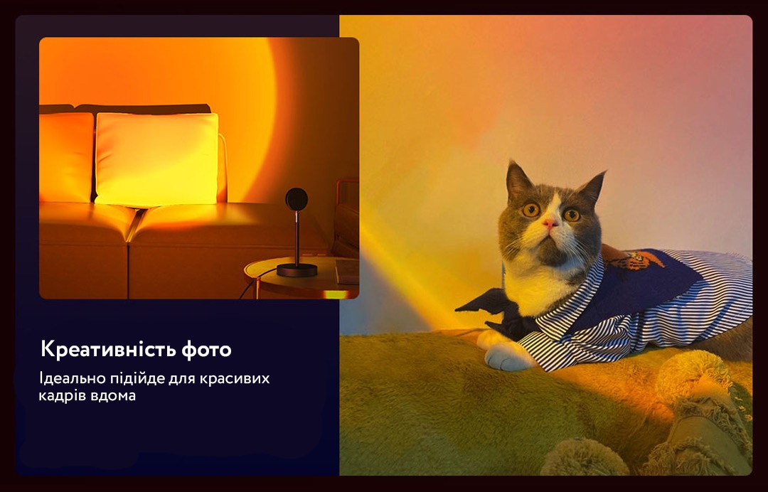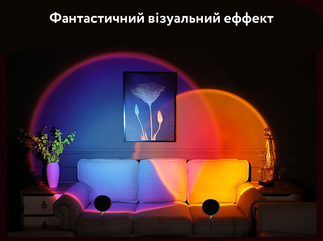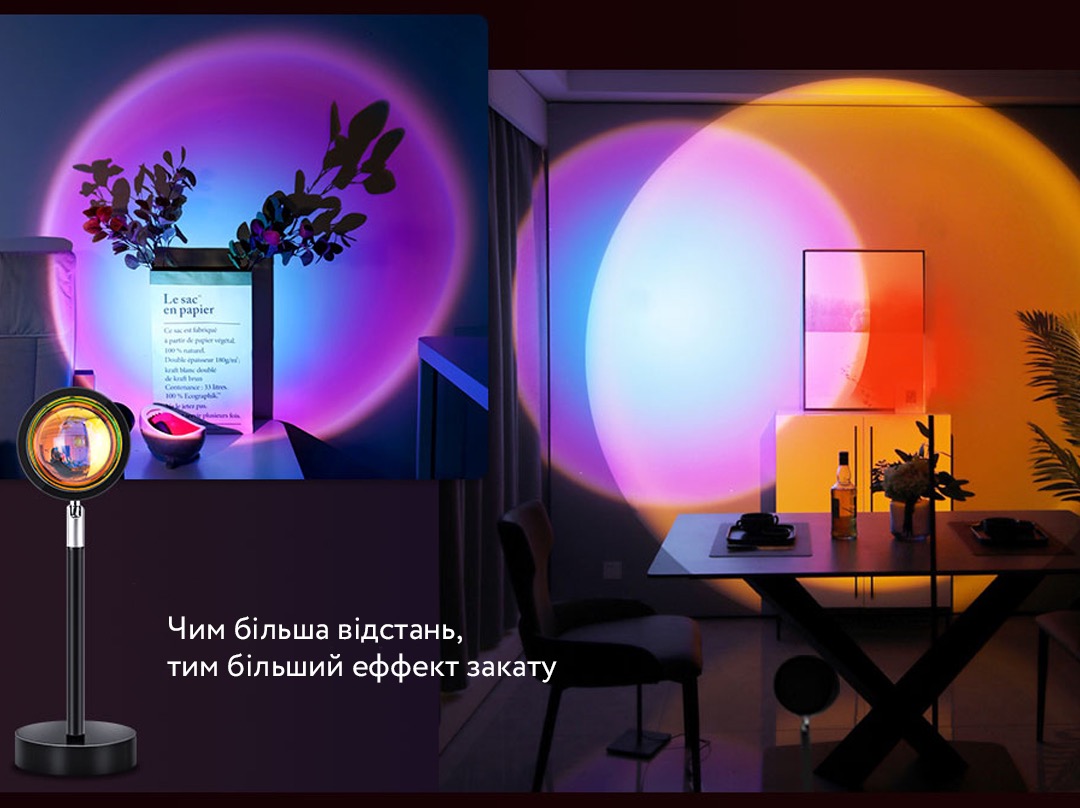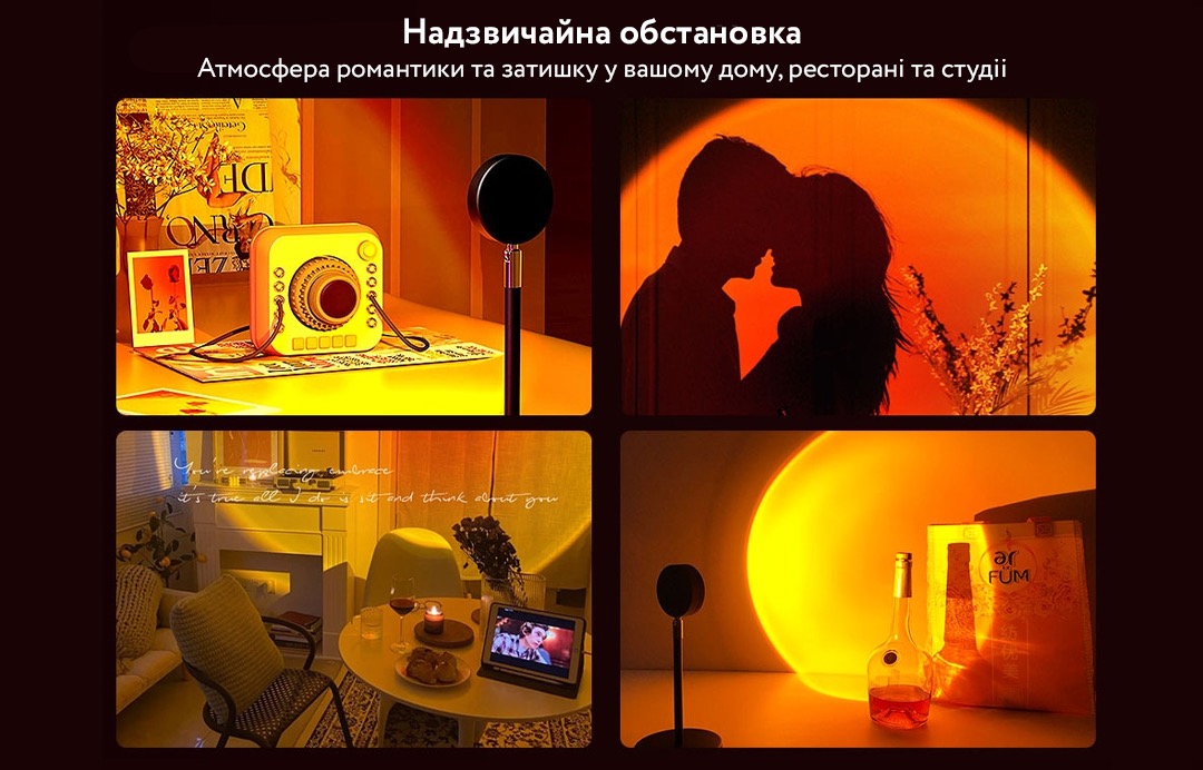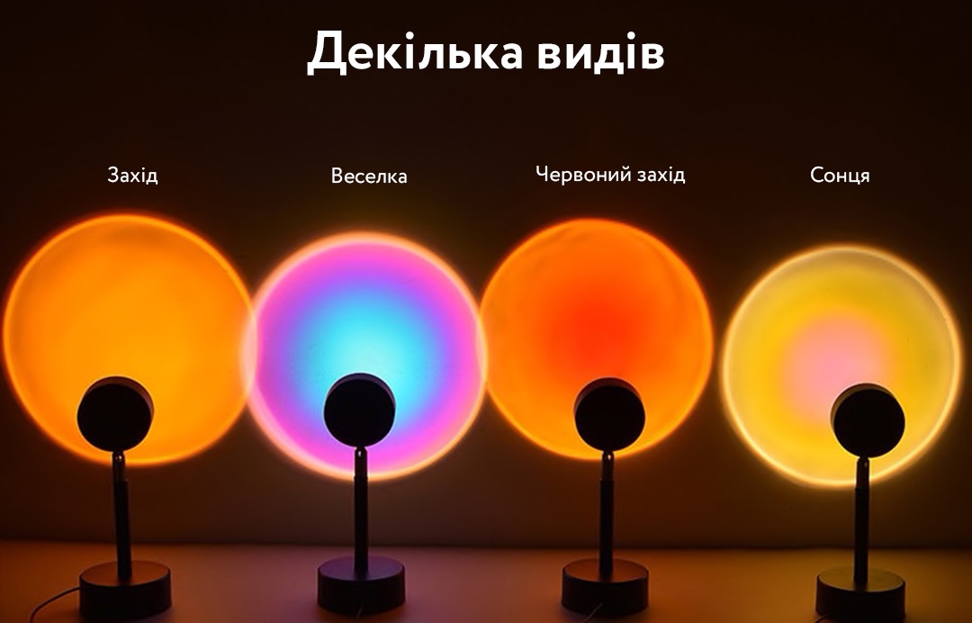 Якщо ви бажаєте створити в своєму будинку теплу сучасну атмосферу, проекційна лампа для заходу - прекрасне рішення для освітлення. Або ж хочете внести сонячне світло в кімнату, в якій мало світла, найкращим рішенням буде проекційна лампа для заходу. Настільний світильник з проекцією заката- це райдужний сучасний світлодіодний світильник який також можна використовувати для вітальні, для спальні, як проектор, торшер, реквізит для фотосесій.