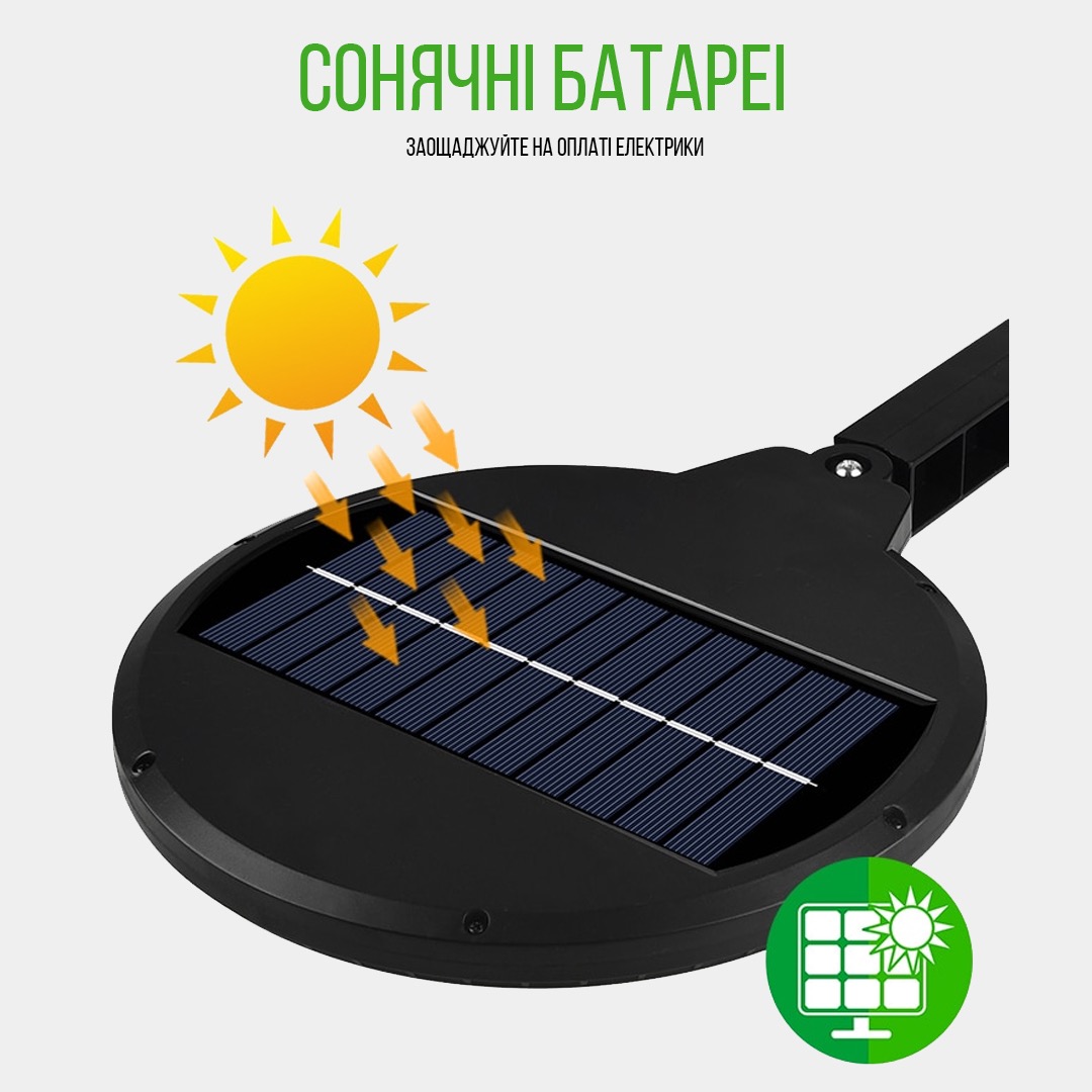 Призначений для автономного освітлення території. Світильник працює від сонячних батарей і тому Вам не потрібно турбуватися про його зарядці або підключенні до мережі. Датчик руху спрацьовує з відстані 7-9 метрів, при куті огляду 120 градусів. Час роботи при повному заряді акумулятора до 1-2 дня. Вбудованих 3 режиму роботи (повний, 50% від потужності при неактивній роботі, 100% потужності в разі руху, 50% потужності).