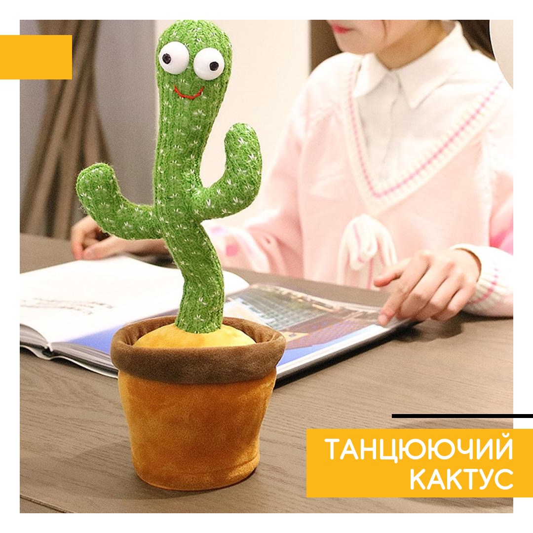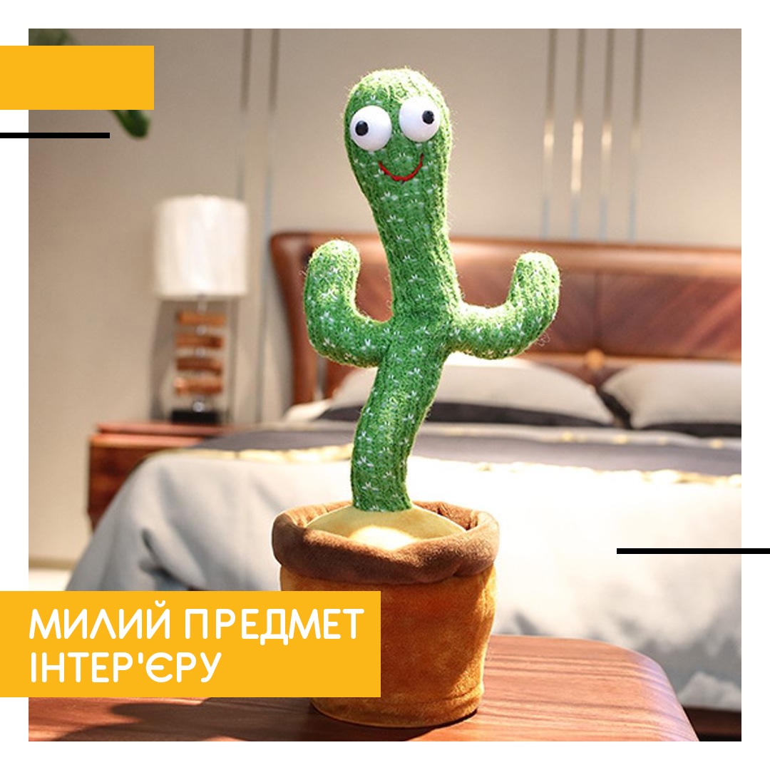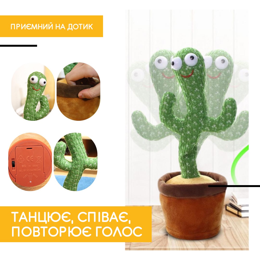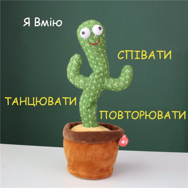 Співає 120 пісень, танцює зі світломузикою і повторює всі звуки навколо, що дуже приваблює дітей) Весела музика і танці підходять для створення приємної атмосфери і підходять для вечірок. Записуючий пристрій в кактусі запише будь-яке ваше пропозицію, яке Ви скажете поруч з танцюючим кактусом, і через 1-2 секунди він повторить ваші слова дуже смішним голосом і витонченим танцем! Функція запису мови 10 секунд. Ця забавна мила іграшка має висоту 34 сантиметрів.