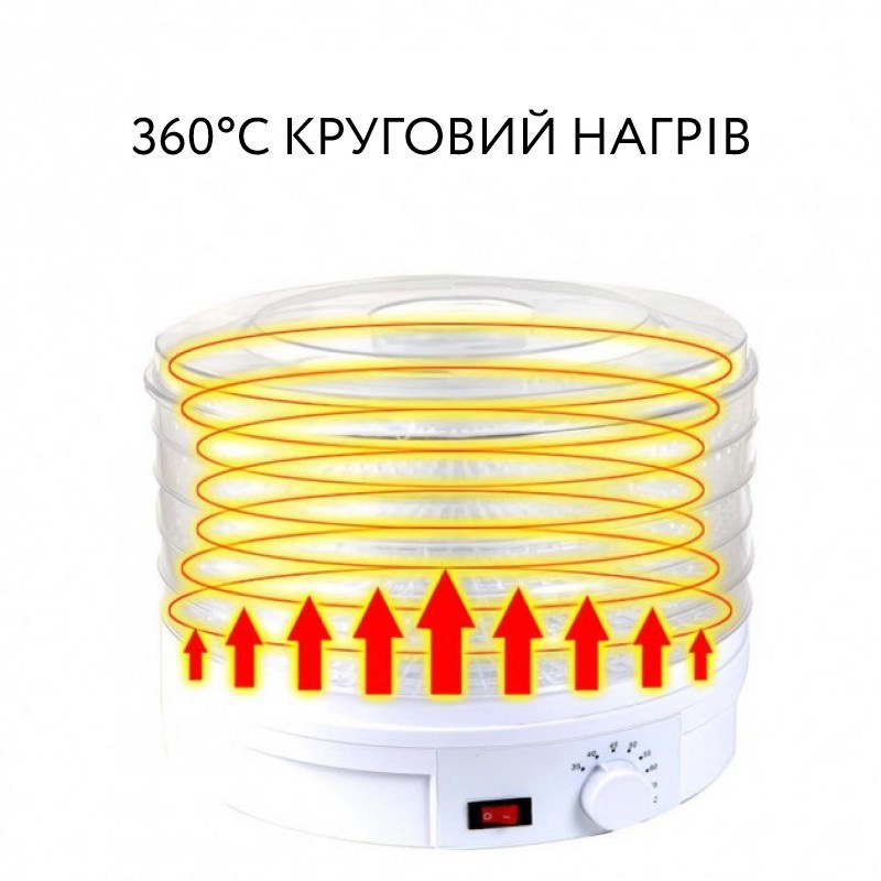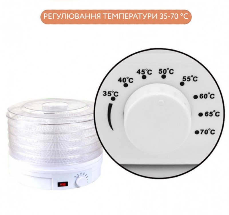Міцний пластиковий корпус та наявність п'яти секцій для розміщення продуктів роблять її ефективною та надійною в роботі. Прозора кришка дозволяє стежити за процесом висушування.